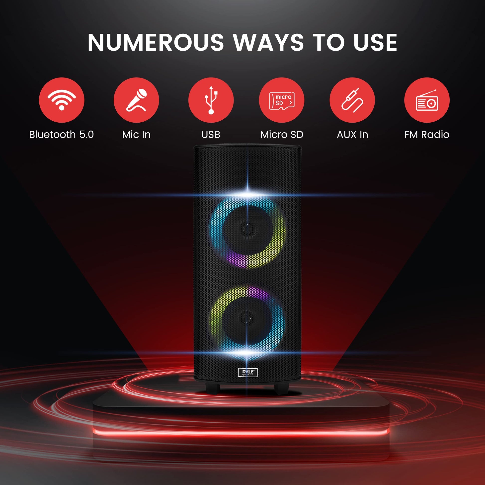 Features: True Wireless Stereo System High-Powered Speaker System Wireless & Portable Speaker System Bluetooth Wireless Music Streaming Ability Includes Wireless Microphone for Karaoke Fun Multi-Color Flashing Ring LED Lights Built-in LED Lights for Stunning Visuals FM Radio with Digital LED Display Built-in Rechargeable Battery Aux (3.5mm) Input MP3 Digital Audio File Support Connect & Stream Audio from External Devices USB Flash Drive Memory Reader Micro SD card reader 1/4’’ Input Jacks for Microphone Ported Enclosure for Extended Bass Response Integrated Extending Carry Handle Treble & Bass sound performance adjustment Convenient trolley and wheels X-Bass button for more powerful bass Many kinds of DJ sound effects selection for more fun Perfect for the Backyard or Park Visits - Instant Party Anytime, Anywhere! Bluetooth Connectivity: Built-in Bluetooth for Wireless Music Streaming Simple & Hassle-Free Pairing Works with All of Today’s Latest Devices (iPhone, Android, Smartphones, iPad, Tablets, etc. Bluetooth Version: 5.0 Bluetooth Network Name: ‘PYLEUSA’ Wireless Range: Up to 32’+ ft. What's in the Box: Speaker System Wireless Microphone Remote Control Power Adapter AUX Cable Tablet stand Technical Specs: Power: 700 Watts MAX Sound System: 2x8'' Subwoofer + 1.5” Tweeter Selectable LED Light Modes: Many kinds of LED lights modes Digital Media File Compatibility: MP3, WMA (USB 2.0) Maximum USB Flash Drive Support: Up to 64GB 、 Housing Construction Material: ABS+ Iron Net + Wooden Built-in Rechargeable Battery: Li-ion 3600mAh, 7.4V Battery Operated Remote Control: 1 Piece Button Cell Battery CR-2025 (Included) Power Supply: 110/240V (9V Power Adapter) AUX Cable Length: 3.94 ft. Dimensions (L x W x H): 11.2’’ x 11.4 ’’ x 27’’ -inches Tablet Stand Dimensions (L x W x H): 11.4'' x 11.22'' x 26.96'' -inches Sold as: 1 Weight: 20.8 lbs.