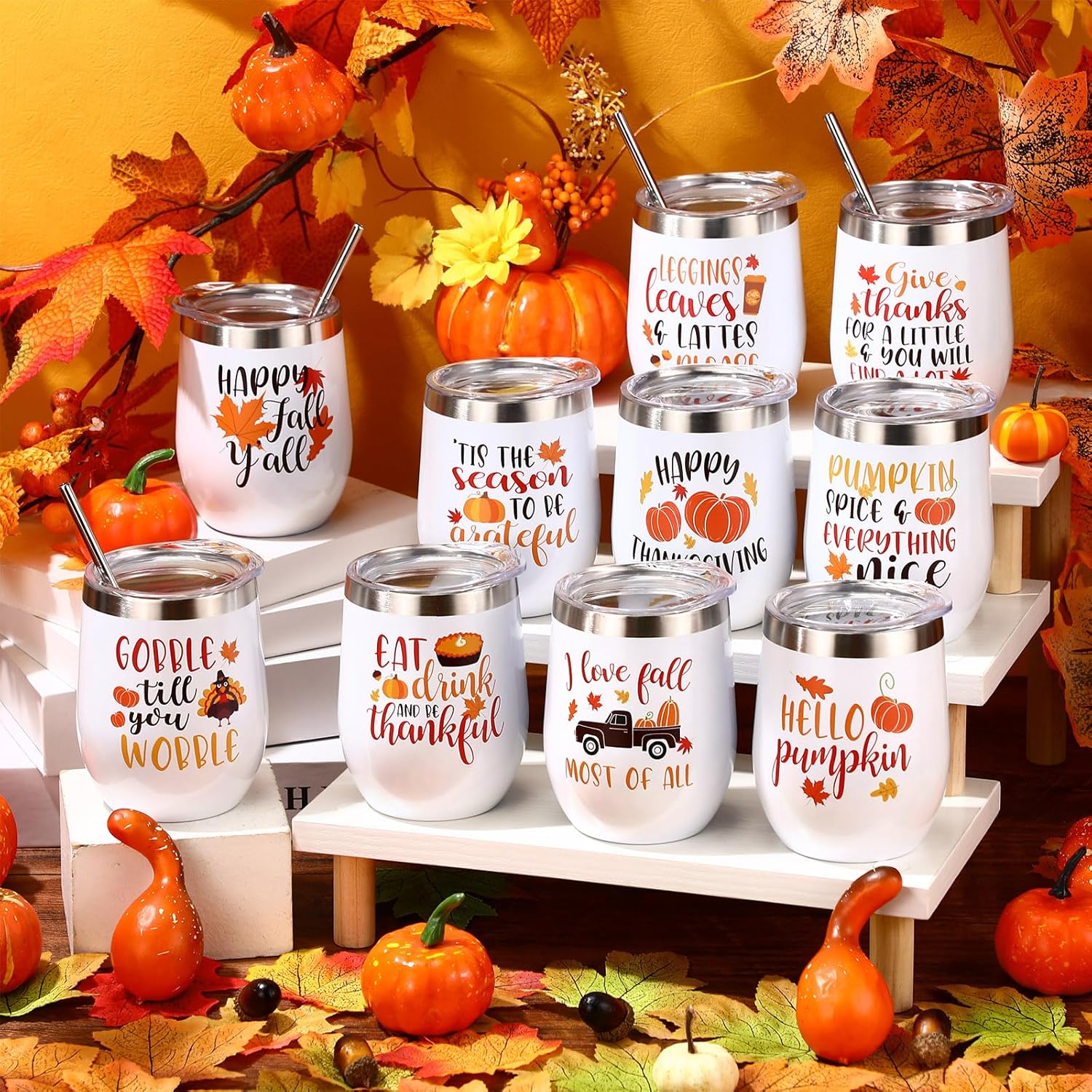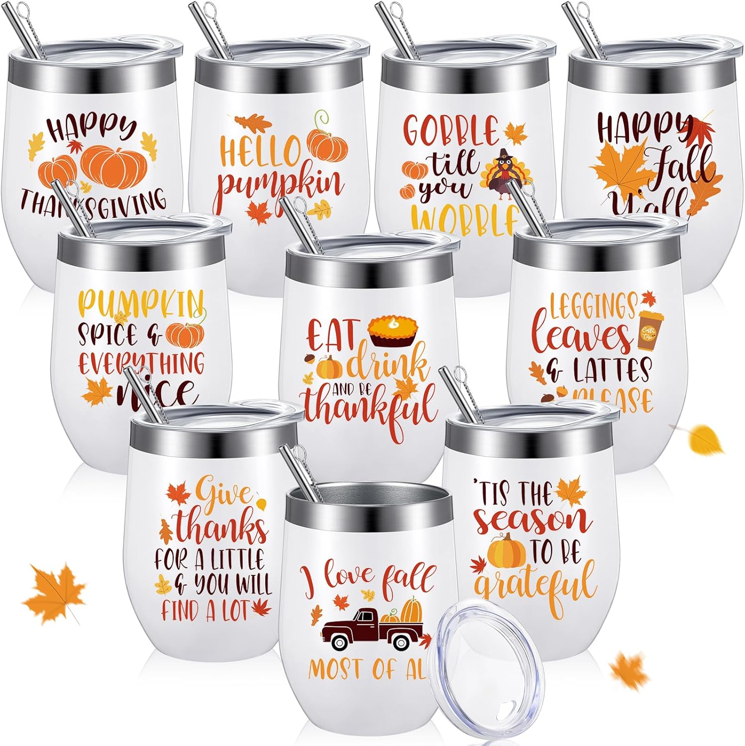 10 Pcs Thanksgiving Fall Tumbler with Lid and Straw Happy Fall Gift 12 oz Pumpkin Coffee Mug Wine Tumbler Maple Leaves Autumn Travel Mug Stainless Steel Insulated for Thanksgiving Party Favor