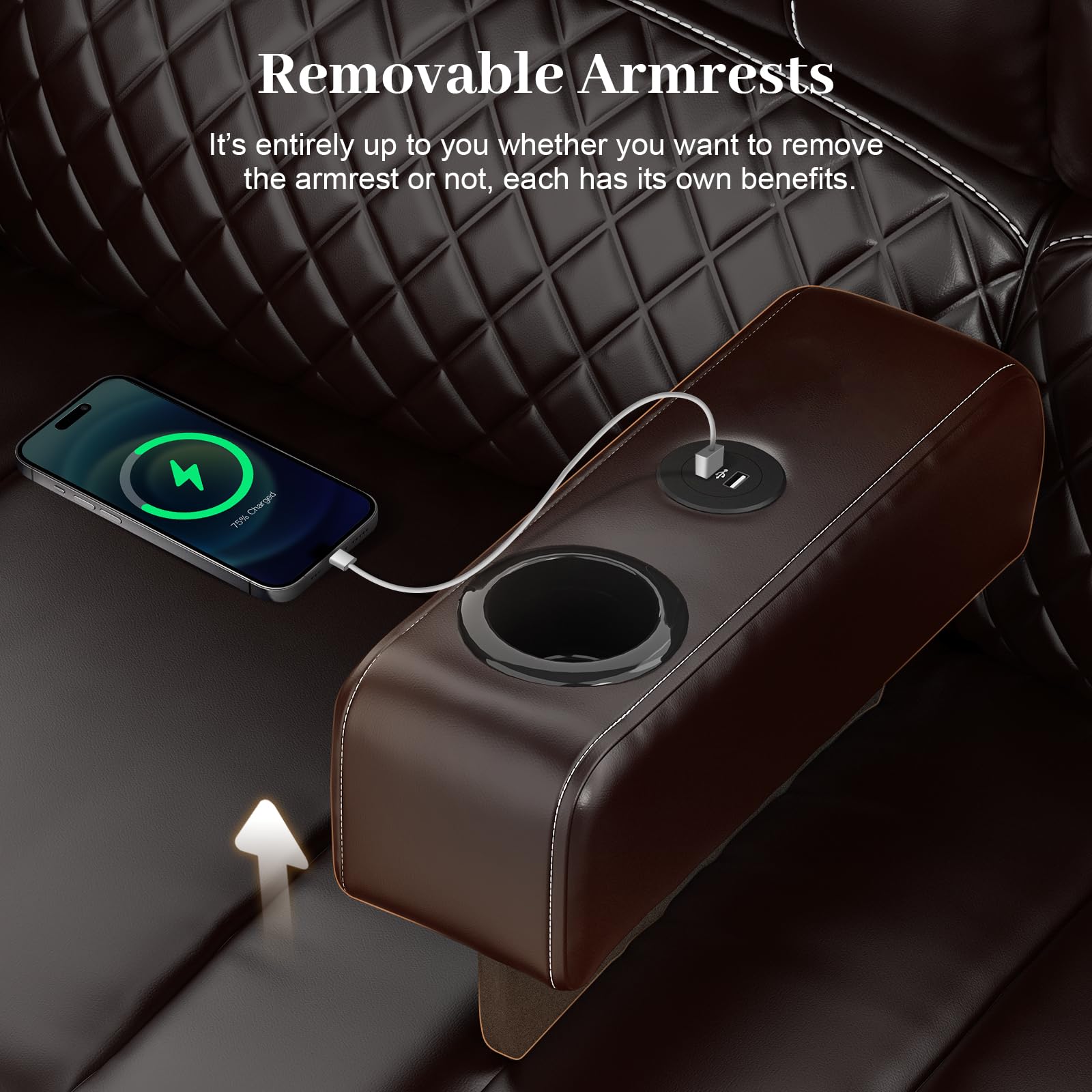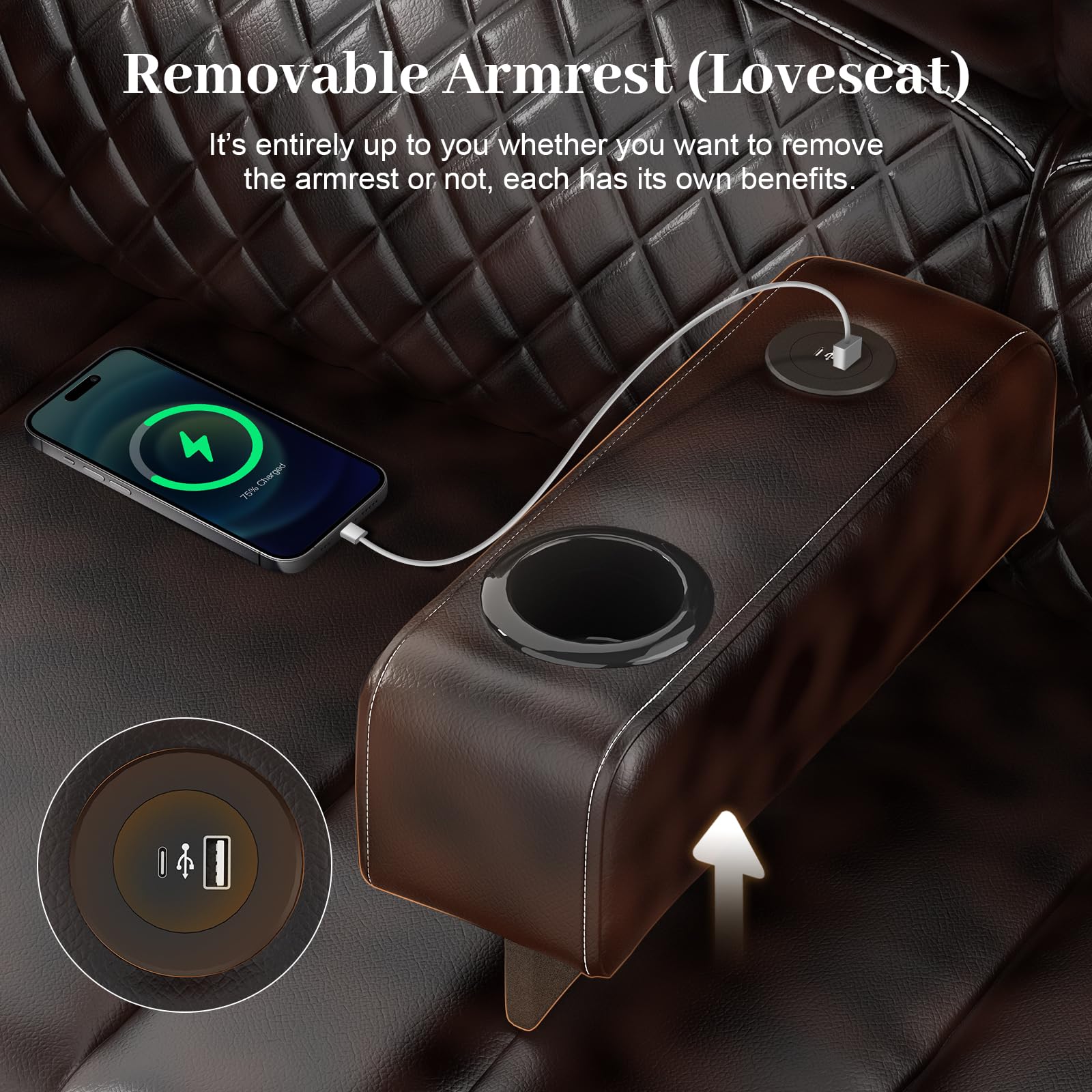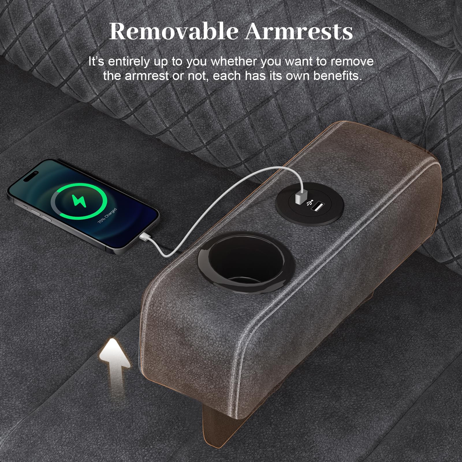 - Removable Armrest: Different from other sofa recliner, the middle armrest of Our reclining couch can be removed at will. Installing the armrest can provide you with additional cup holders, 2 USB charging ports, which makes the entire The sofa has more functions. Of course, dismantling it also has advantages. You can be closer to your partner without obstruction, and the space is more spacious.
