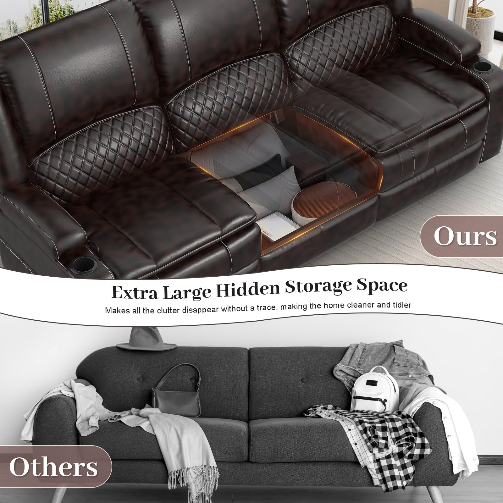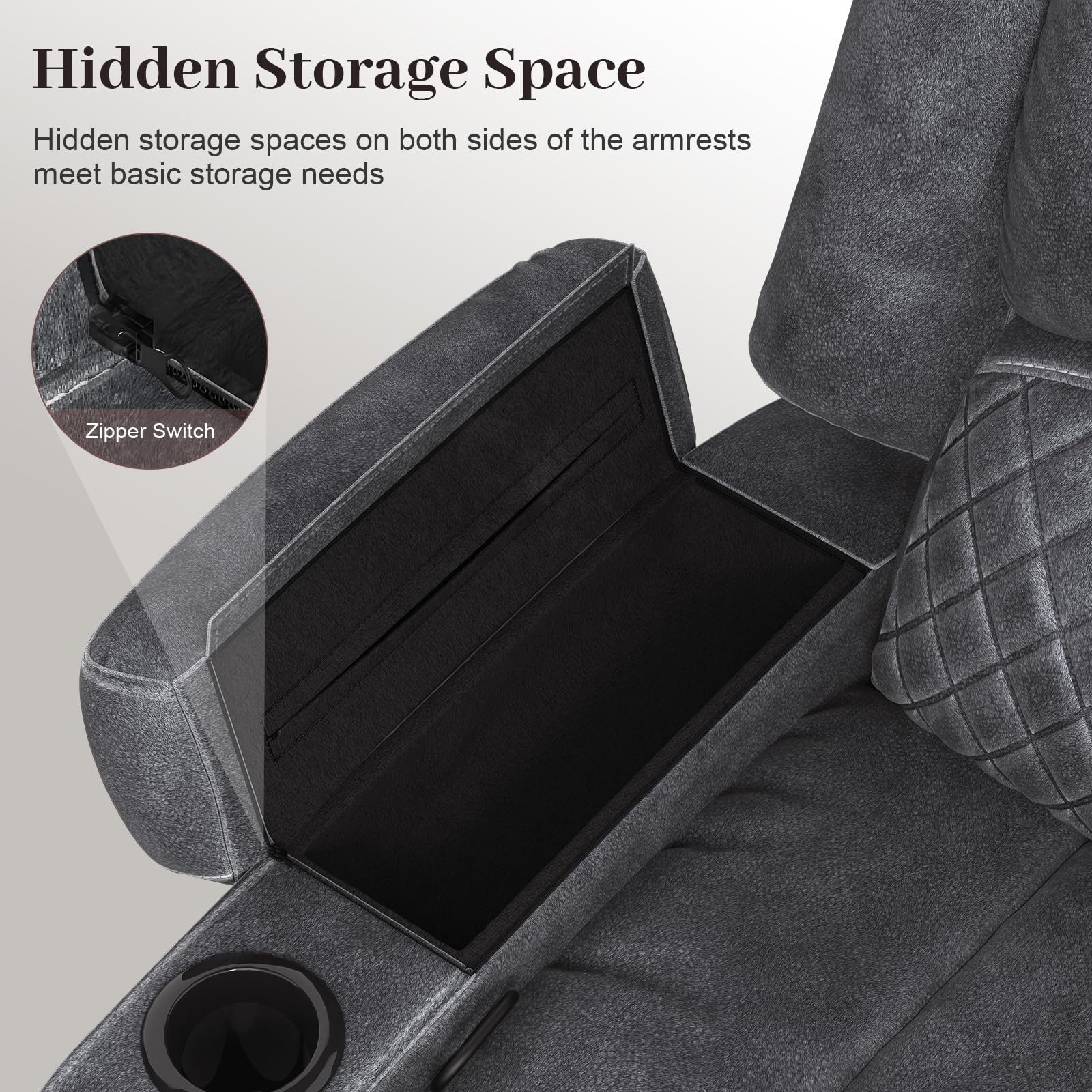 - Hidden Storage Space: There are hidden storage spaces on both sides of the armrests of the reclining couches set for living room. They use a zipper switch design and the opening size is optional. Not only that, the entire armrest can be flipped open, allowing you to place taller food such as wine bottles, it can fully meet the storage needs on the seat.