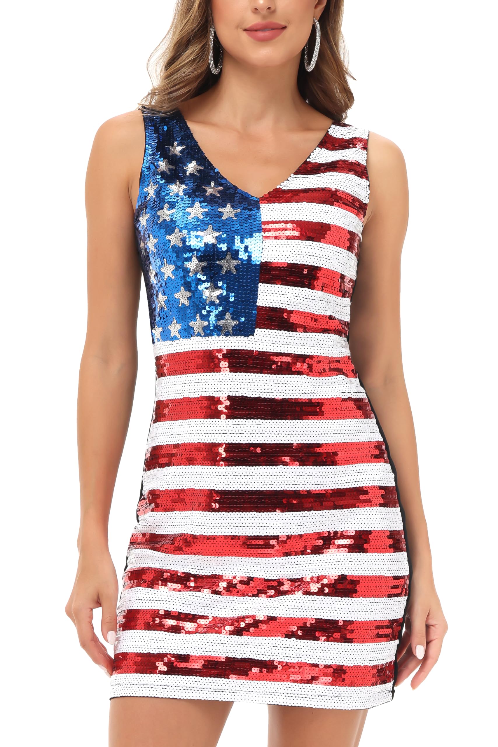 Anna-Kaci Women's American Flag Sequin Dress V-Neck Sleeveless USA Patriotic Striped Glitter Tank Mini Dress