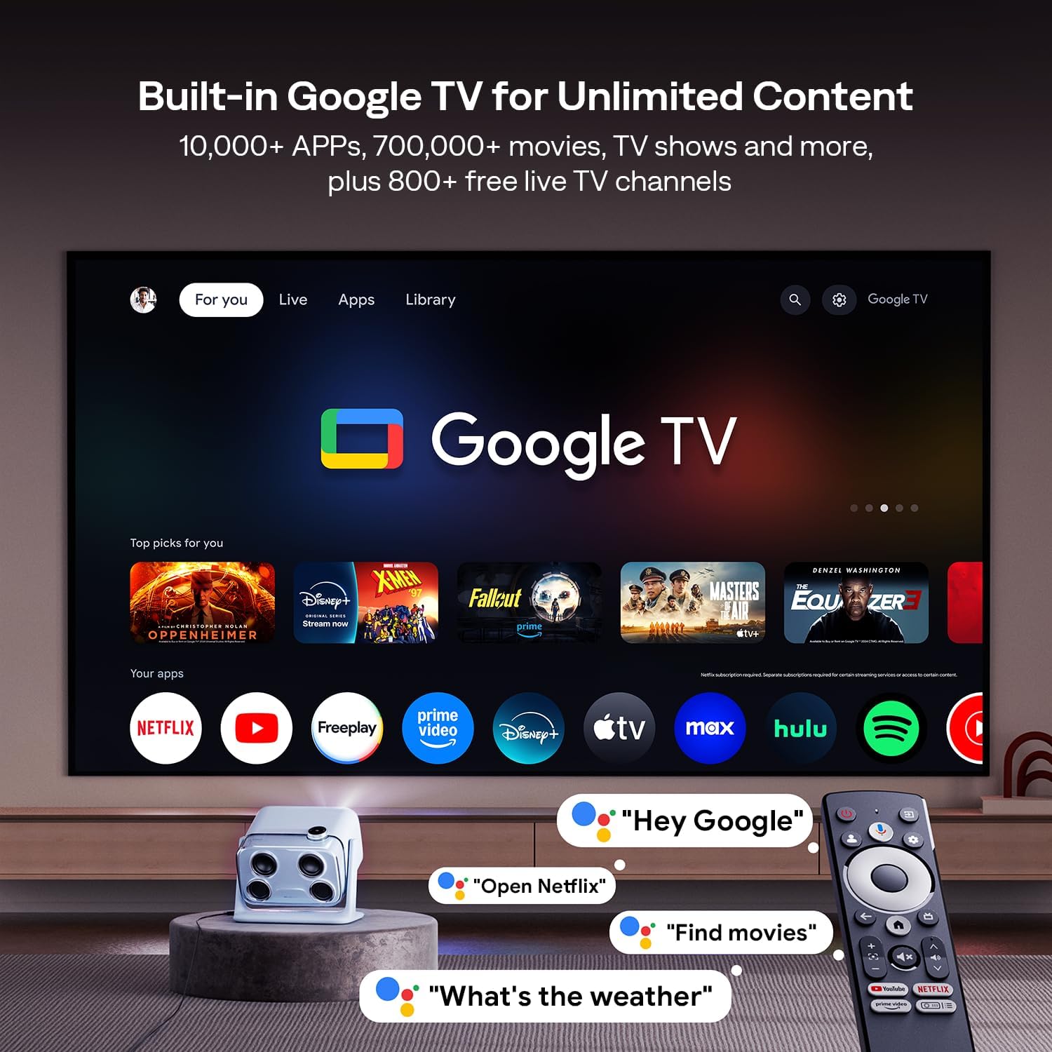 - Official Unlimited Streaming, Massive Entertainment: BOOM mini smart projector brings built-in Google TV to your big screen, unlocking 10,000+ apps, including NetfIix, YouTube, and the hard-to-find, officially licensed Disney+ and Hulu. No extra streaming stick needed. With 2GB RAM + 16GB storage, enjoy smooth, uninterrupted entertainment—just plug in, power up, and start watching.