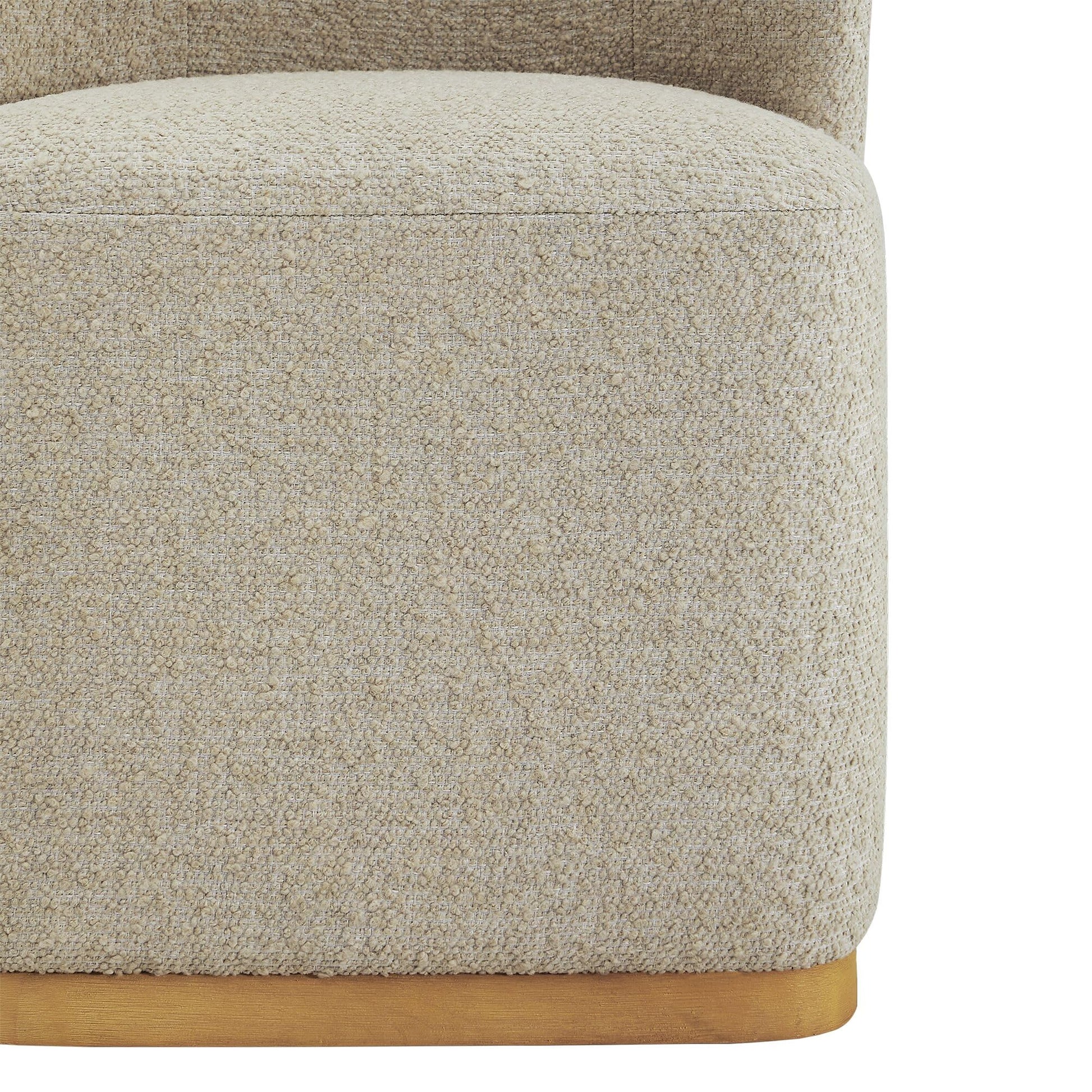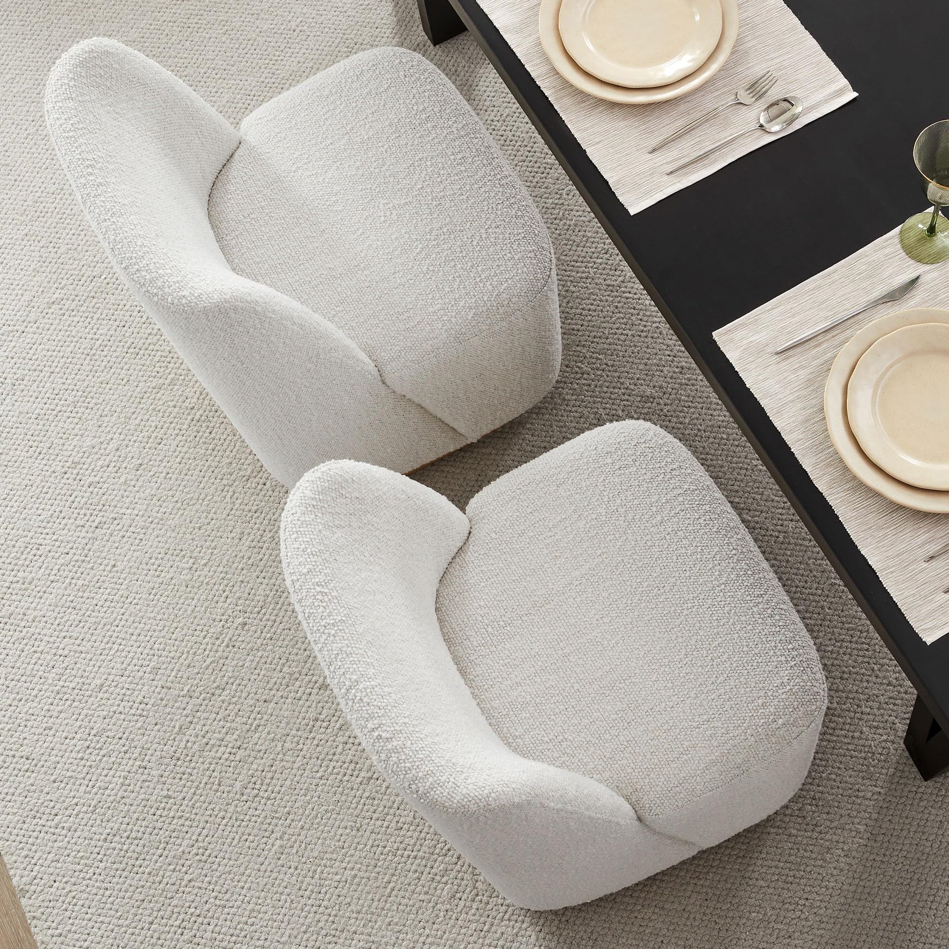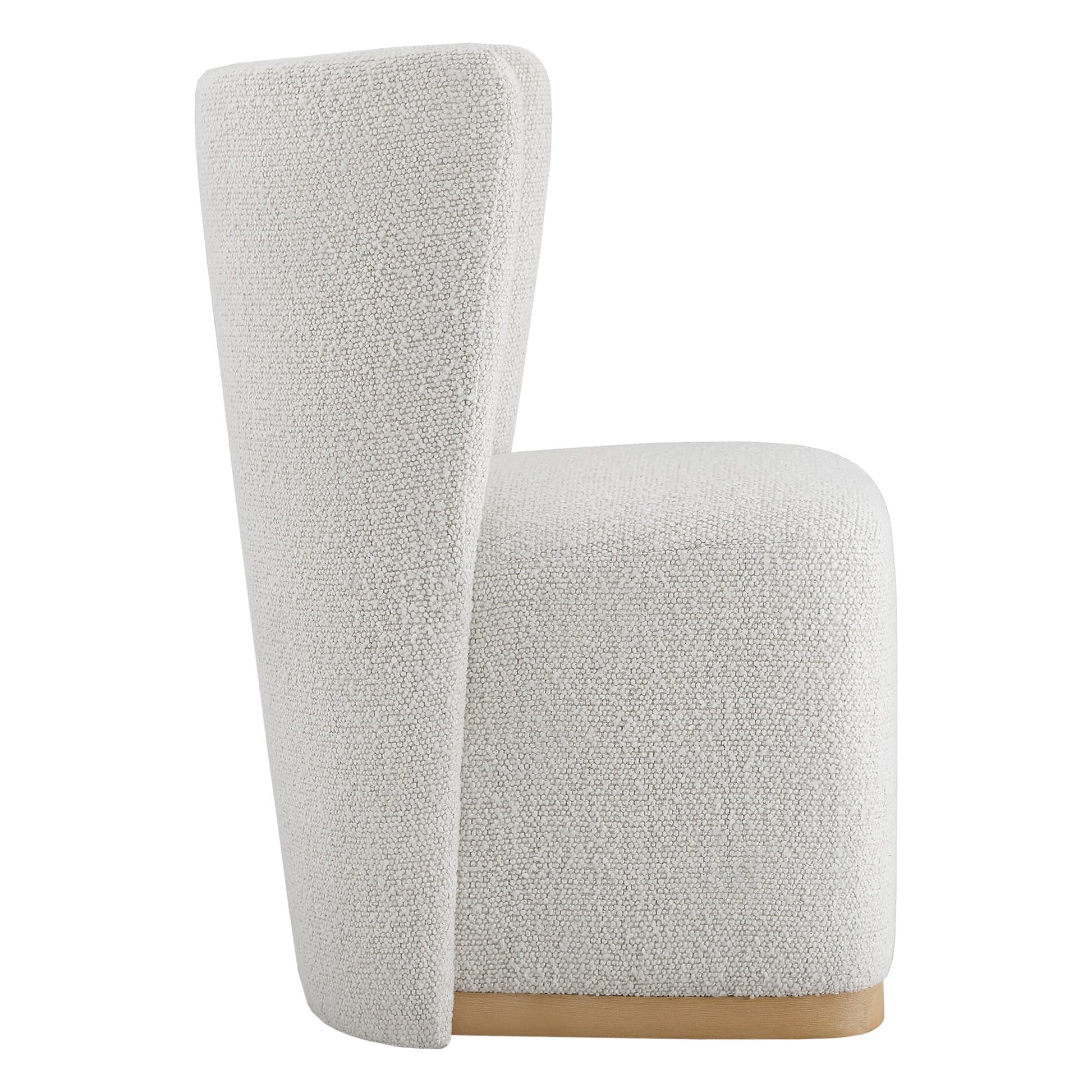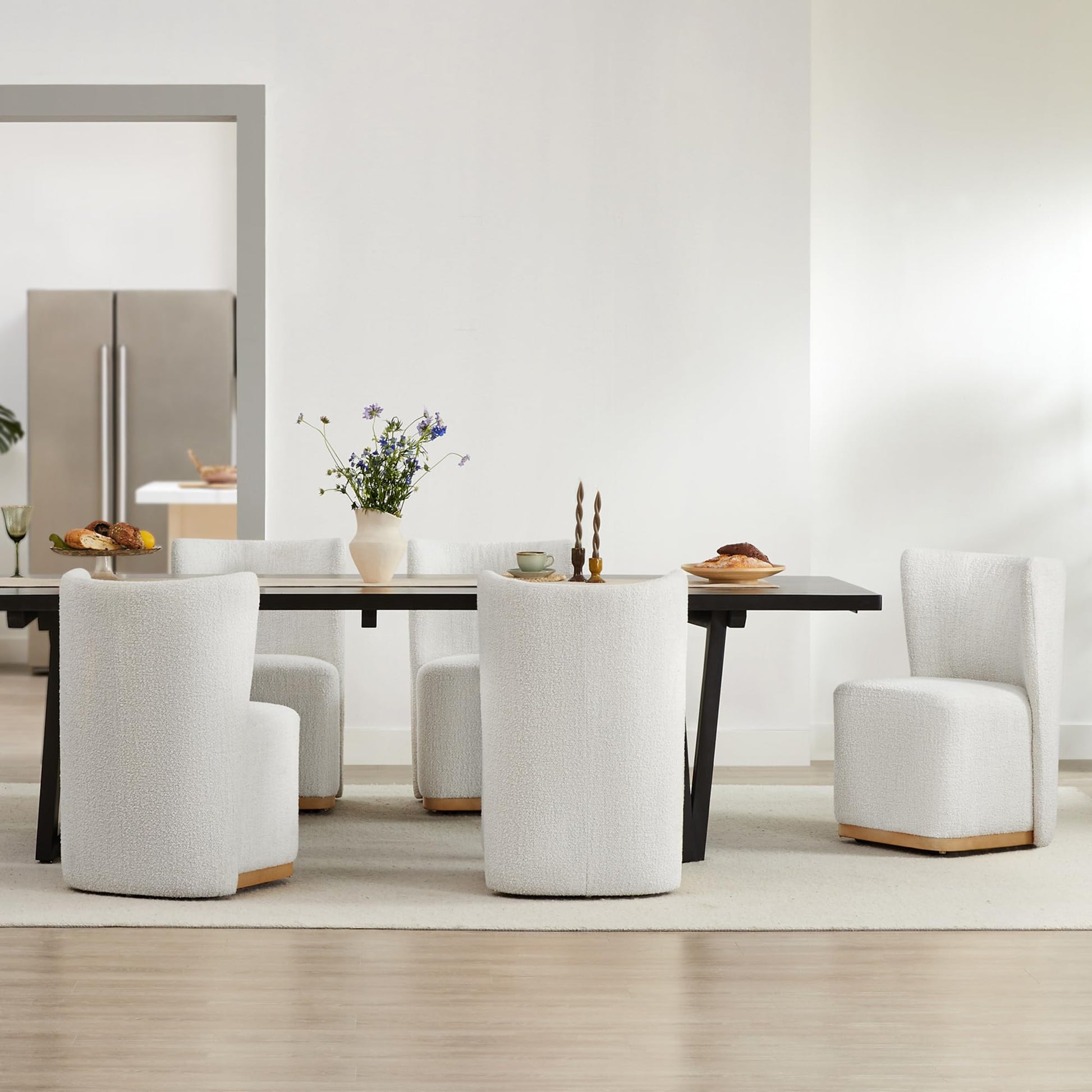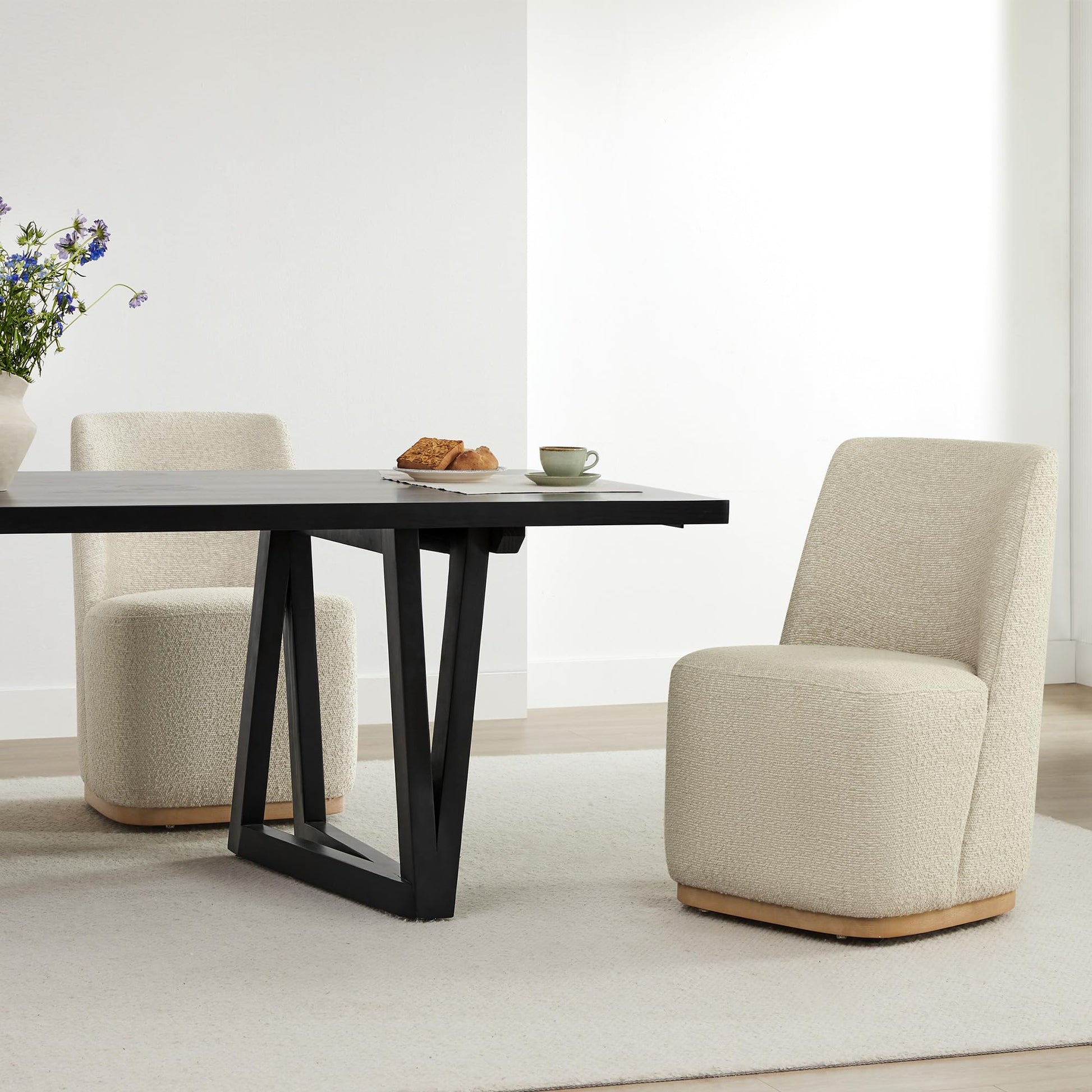 - With its sleek, angled back and fully upholstered design, this modern dining chair epitomizes the principles of aerodynamic elegance. Crafted with a high-quality wooden base, it provides a touch of natural aesthetic while maintaining sturdy support without the need for casters. The chair is dressed in richly textured boucle and chenille fabrics, padded with soft, dense foam for enduring comfort and an exquisite tactile experience. Concealed easy-glide wheels tucked beneath a wooden plinth ensure effortless movement and smooth mobility across various spaces.