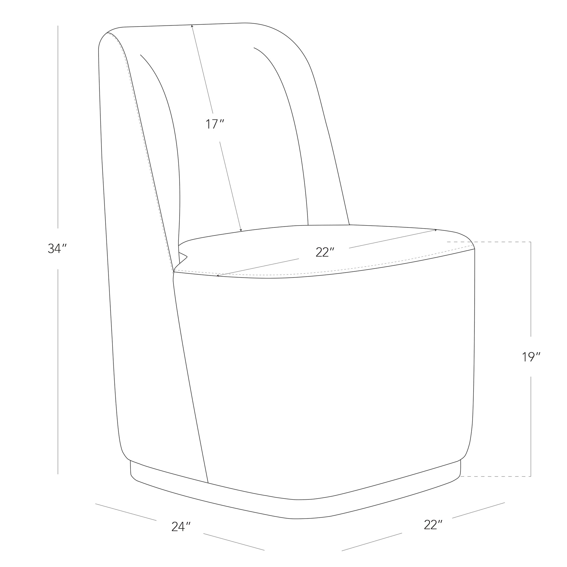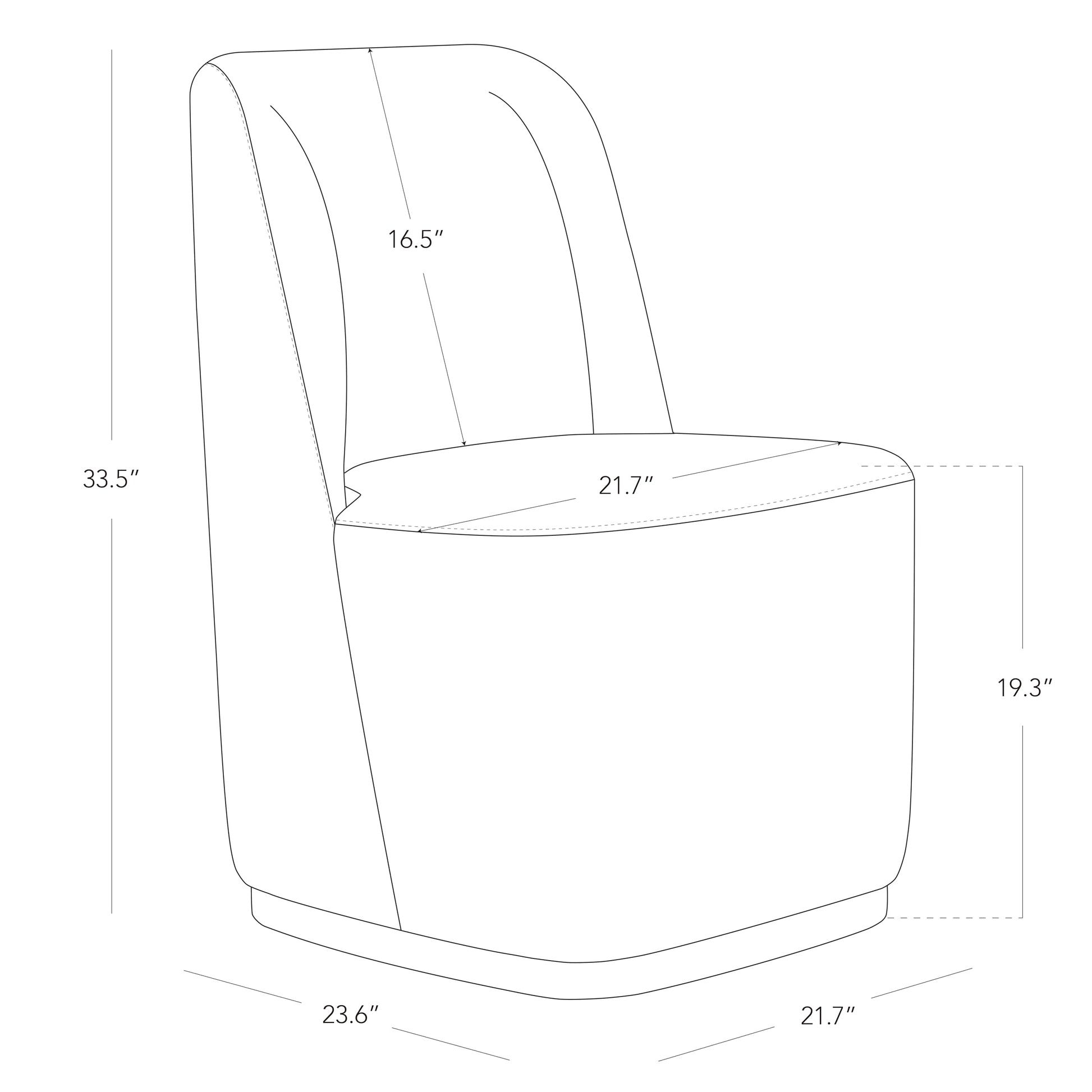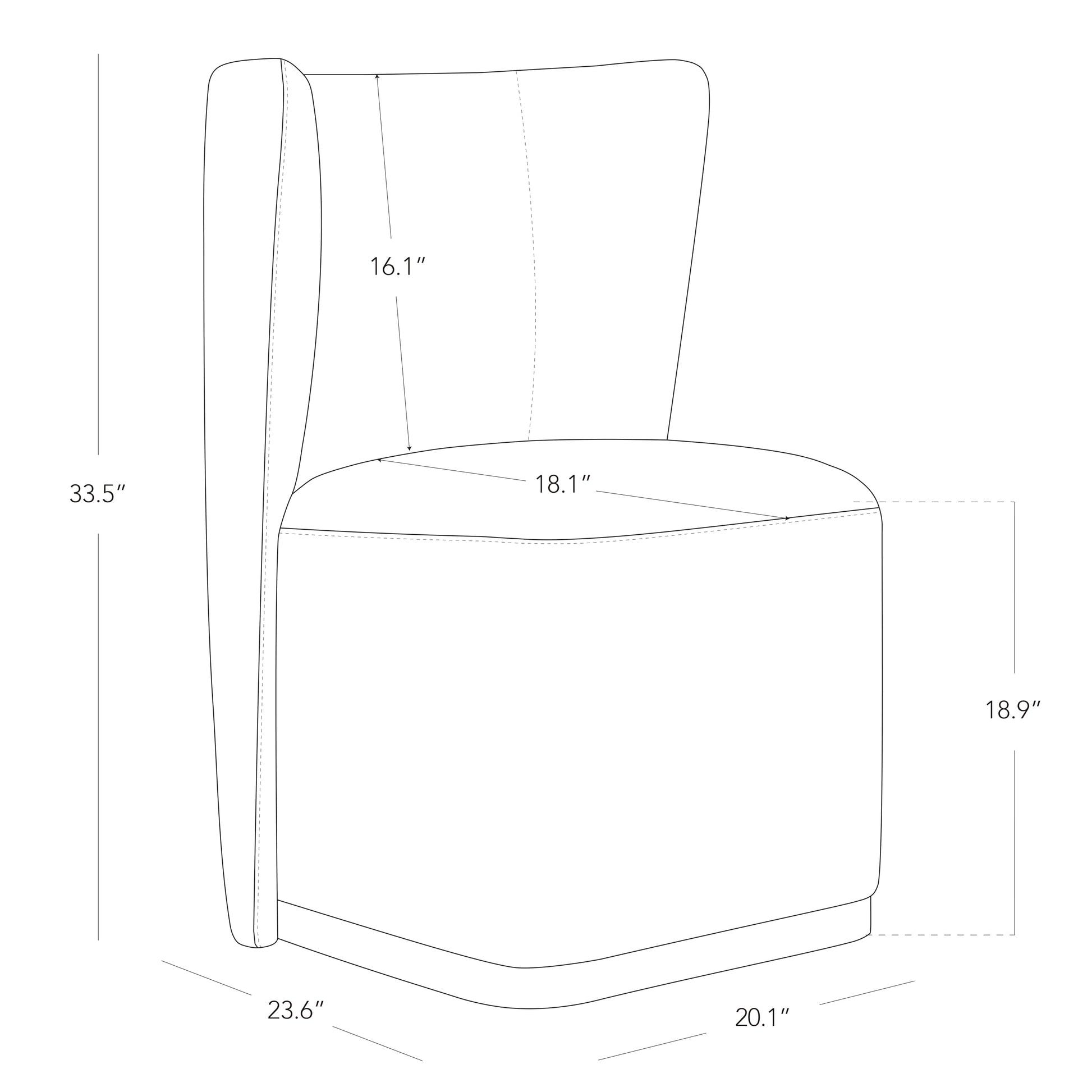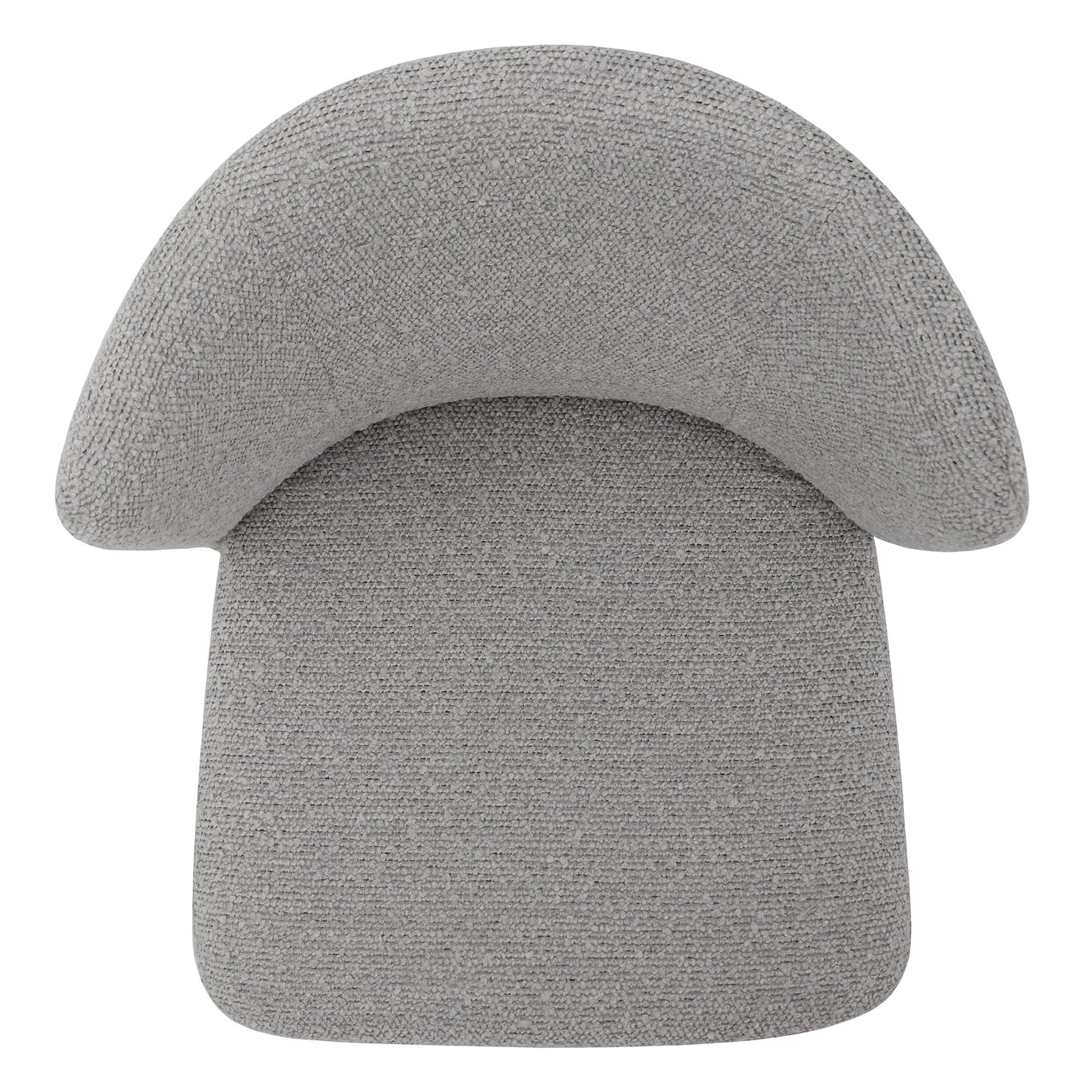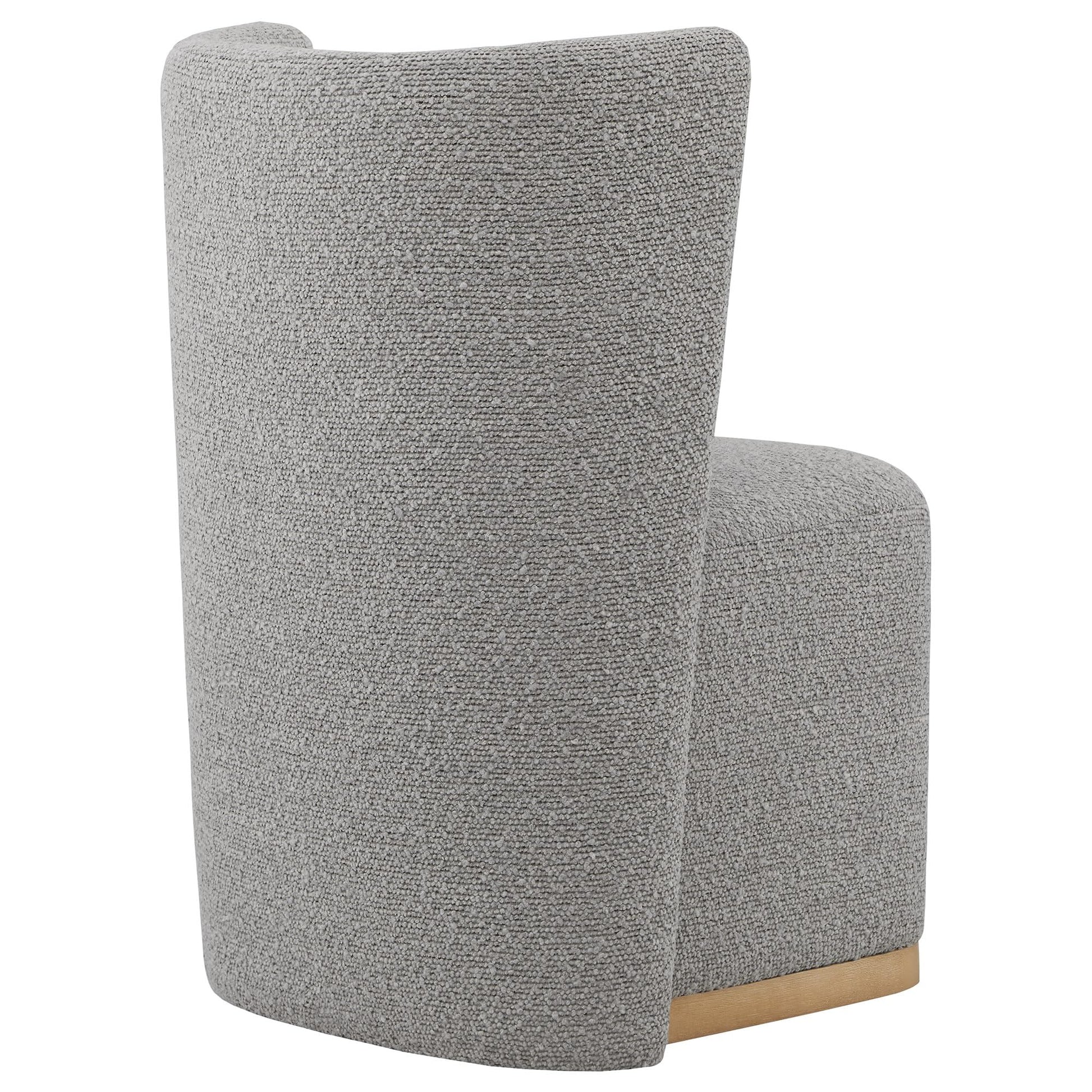 - With its sleek, angled back and fully upholstered design, this modern dining chair epitomizes the principles of aerodynamic elegance. Crafted with a high-quality wooden base, it provides a touch of natural aesthetic while maintaining sturdy support without the need for casters. The chair is dressed in richly textured boucle and chenille fabrics, padded with soft, dense foam for enduring comfort and an exquisite tactile experience. Concealed easy-glide wheels tucked beneath a wooden plinth ensure effortless movement and smooth mobility across various spaces.