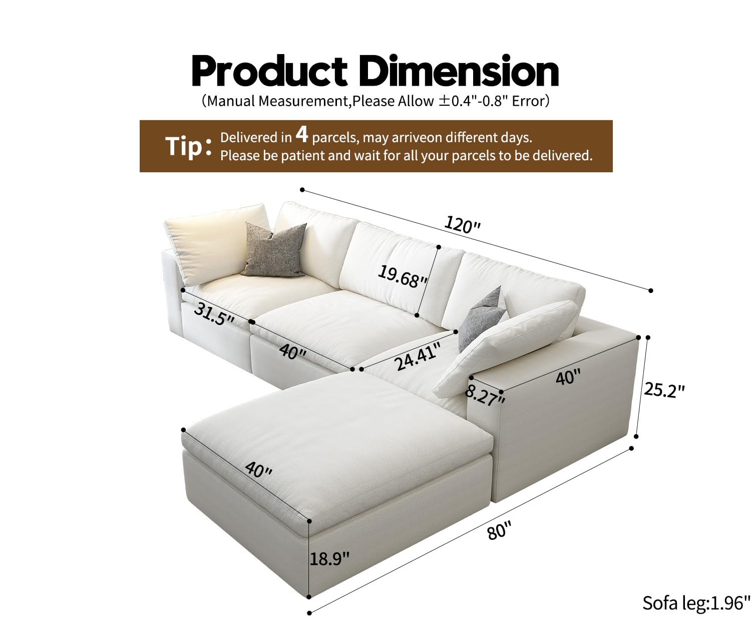 - 【Assembly & Dimensions】Enjoy the fun of assembly with your loved ones! Including 2 Seater Sofa + 1 Middle Sofa+1 Ottoman. 2 Pillows. Overall Size: 120 "W x 80"D x 25.2 "H. Sofa legs: 1.96" H. Tips: The cushions are vacuum-packed. After opening the package, please wait 48 hours to let it come back to its original shape for the better experience. Note: The 2 grey pillows in pictures are not included.