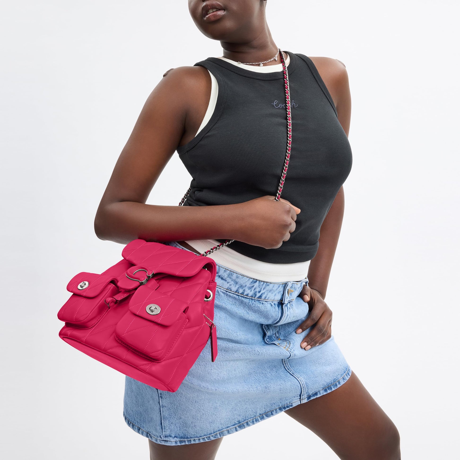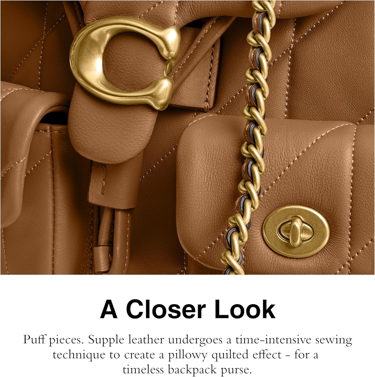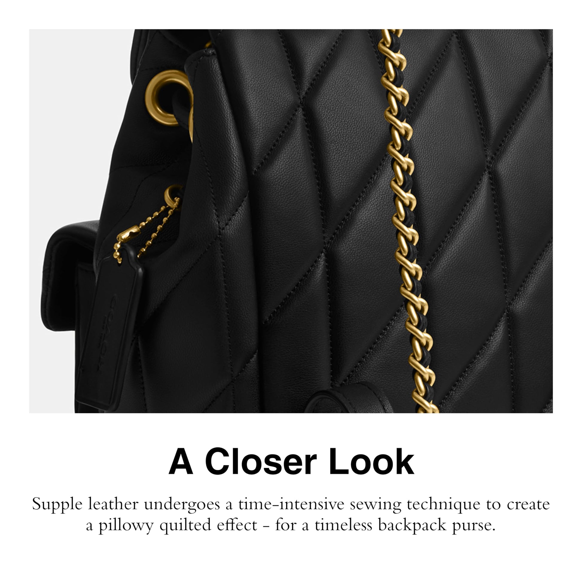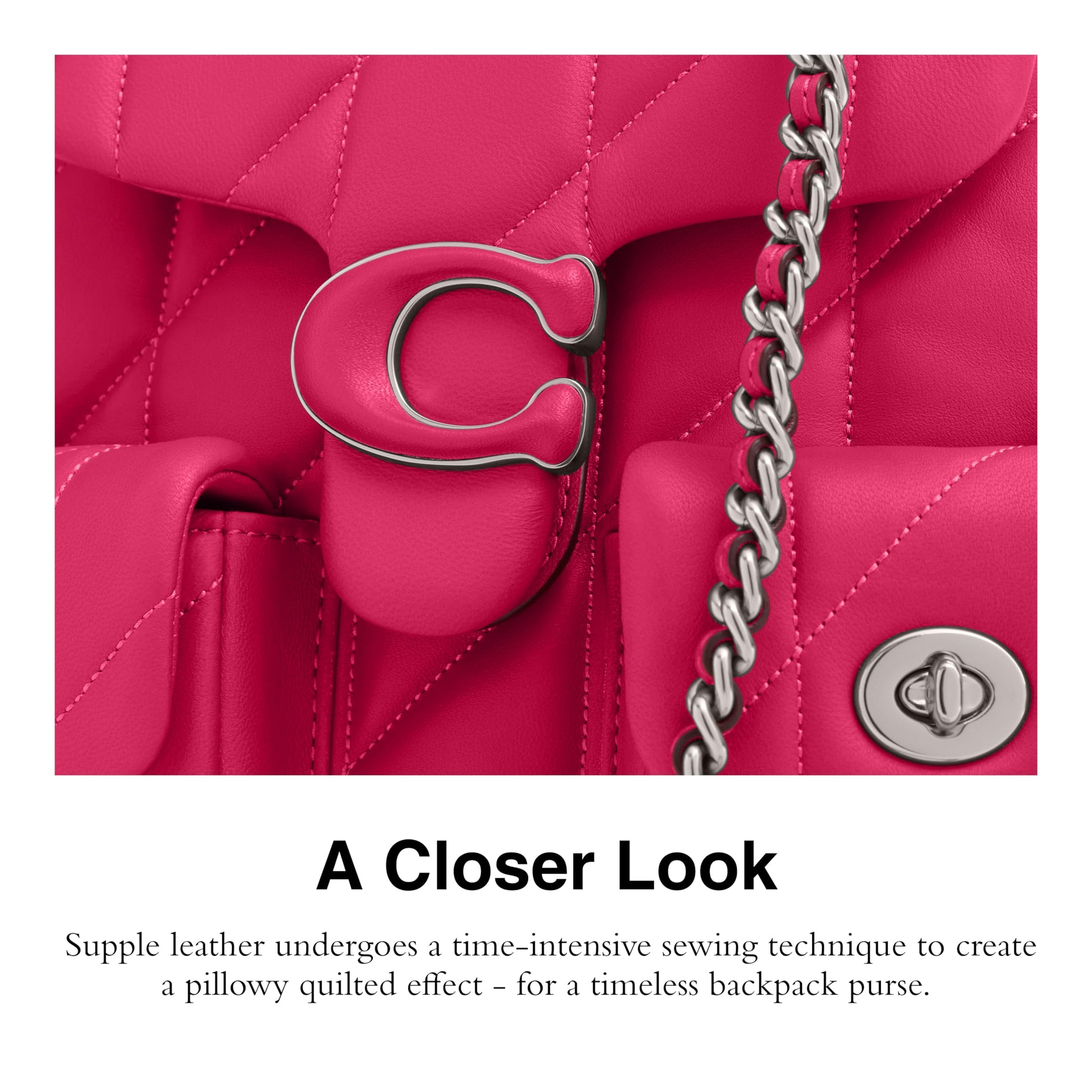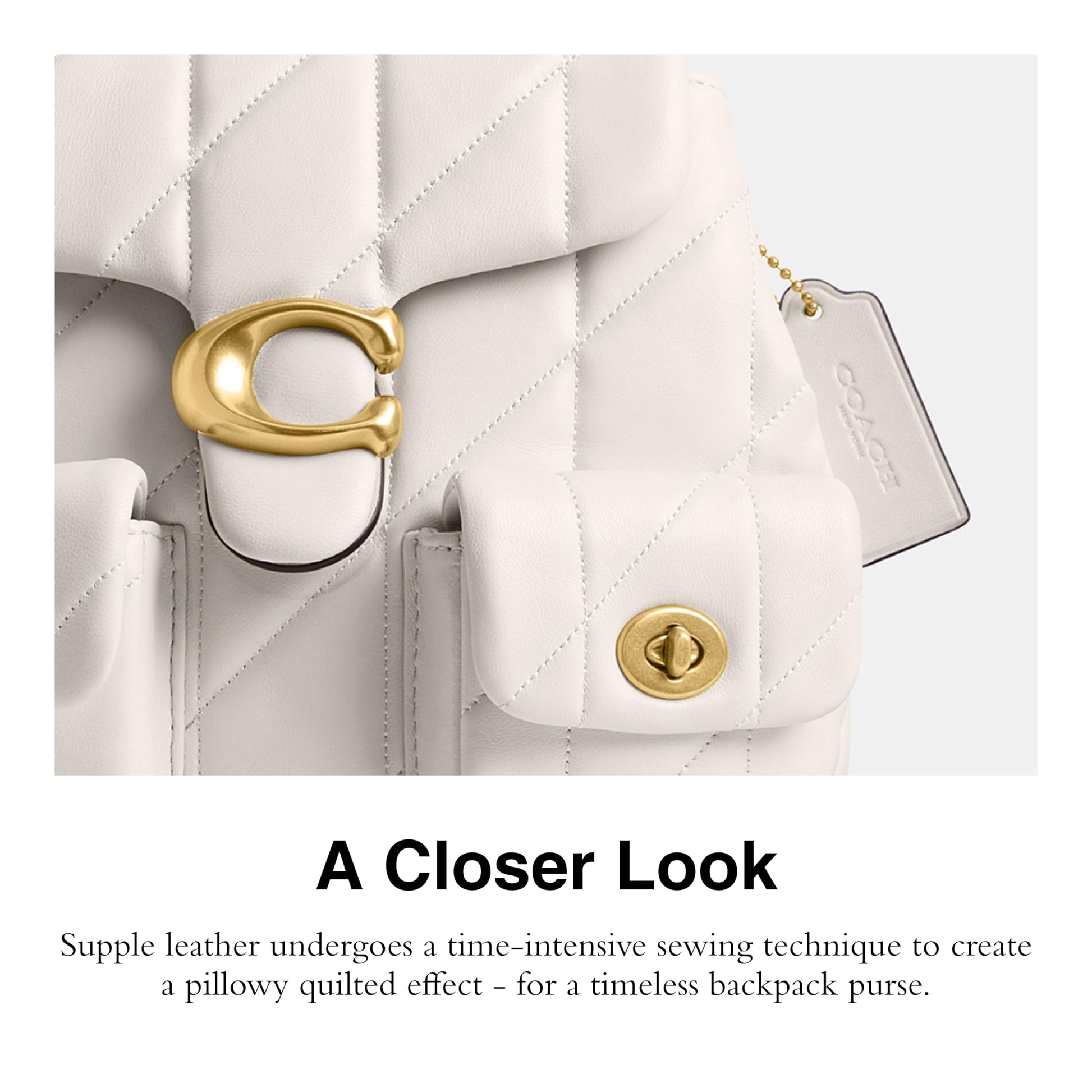 A modern take on an archival 1970s Coach design, our versatile Tabby backpack is a hybrid style that easily converts from backpack to crossbody or shoulder bag. Crafted of quilted plush, ultra-soft nappa leather, the compact style has convenient cargo front pockets detailed with our iconic turnlock closures and adjustable leather-and-chain back straps that convert to a crossbody strap. It’s finished with our Signature hardware for a heritage touch.