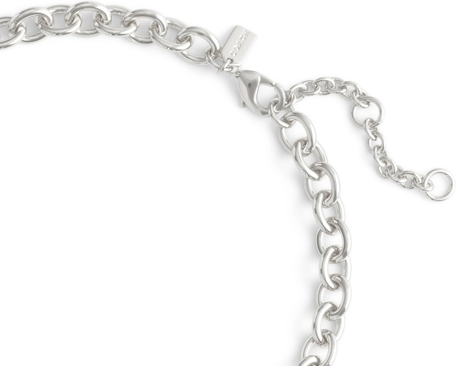 Striking chain necklace featuring heart locket pendant adorned with quilted signature sculpted C motif and delicate crystal stone accents. Pendant is a functional locket. Necklace has an adjustable lobster clasp closure. Made from brass and glass crystal.