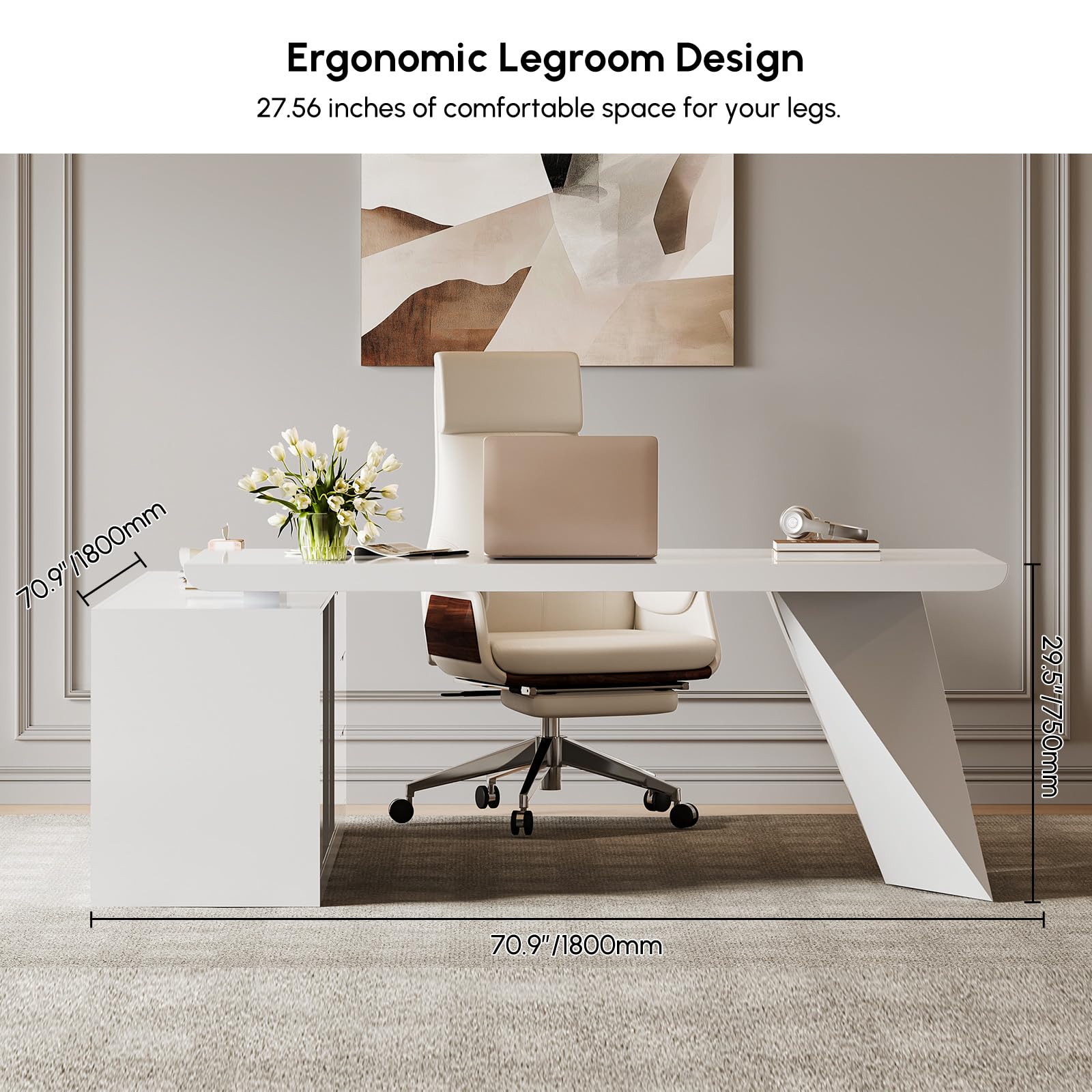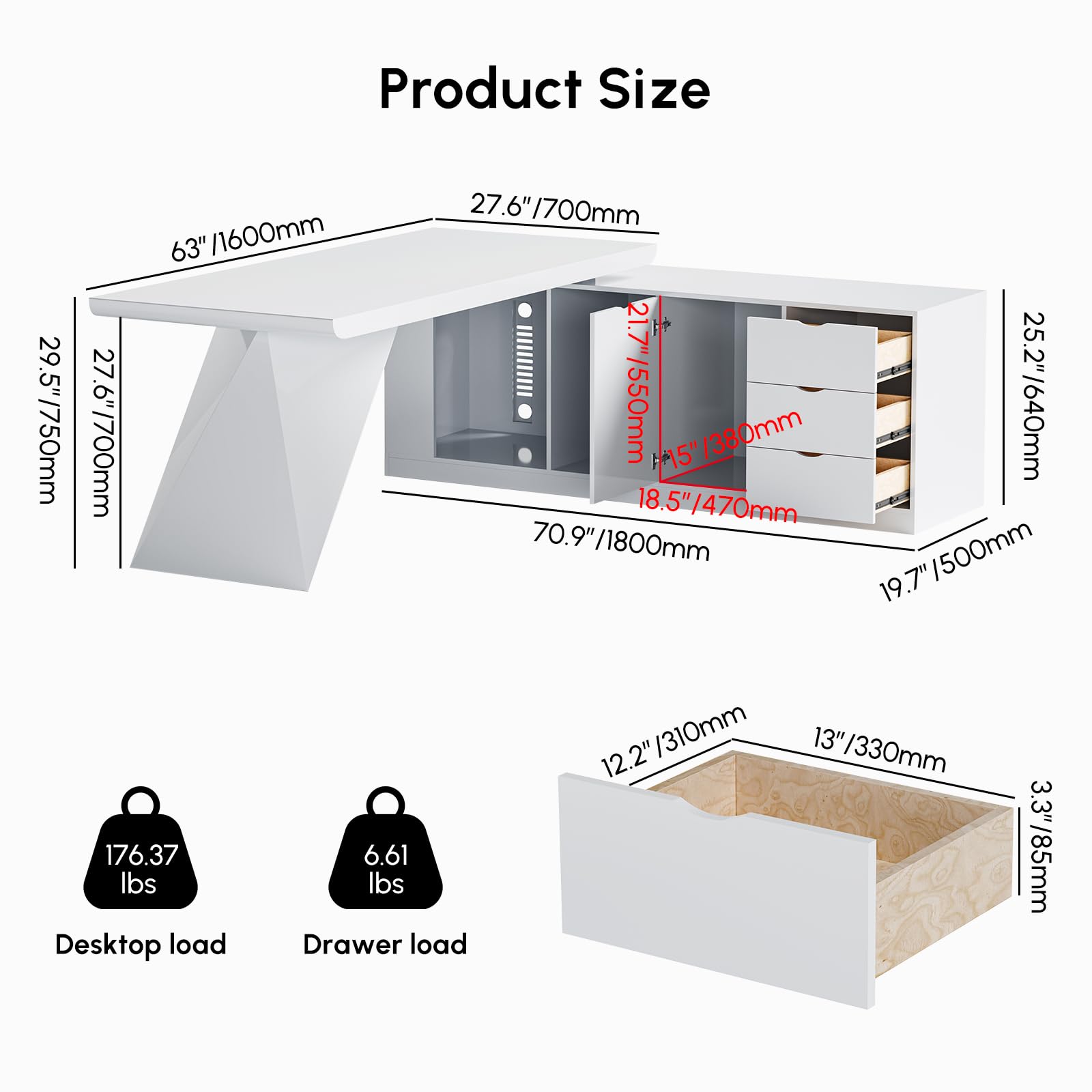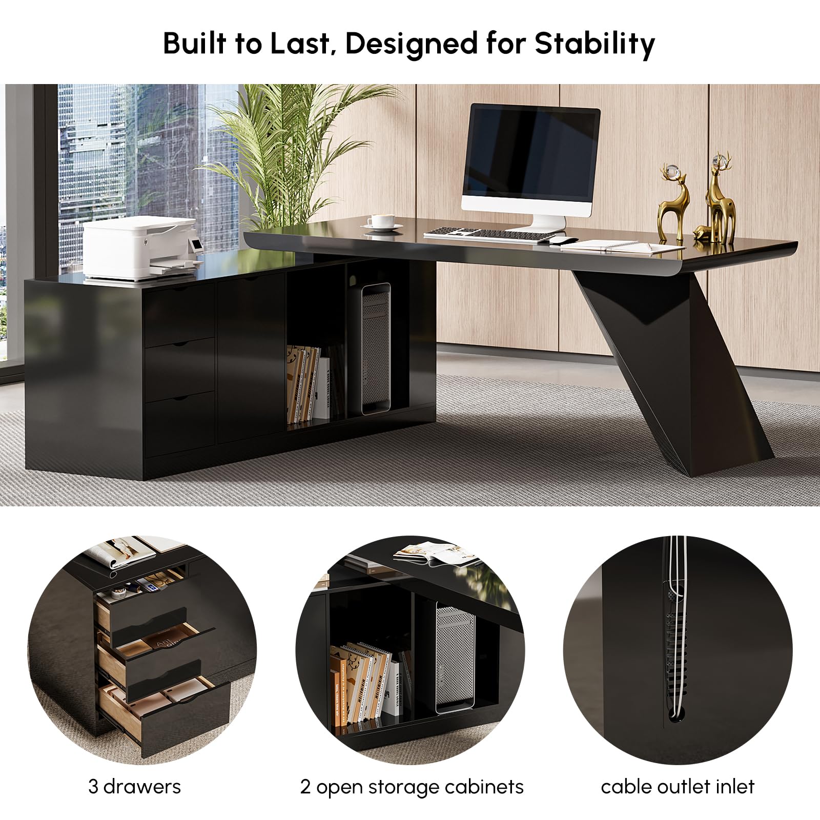 homary 70.9" Modern L-Shape Executive Desk, Home Office Desk with Drawers & Cabinet Modern Computer Desk for Home Business Furniture, Black, Right Hand