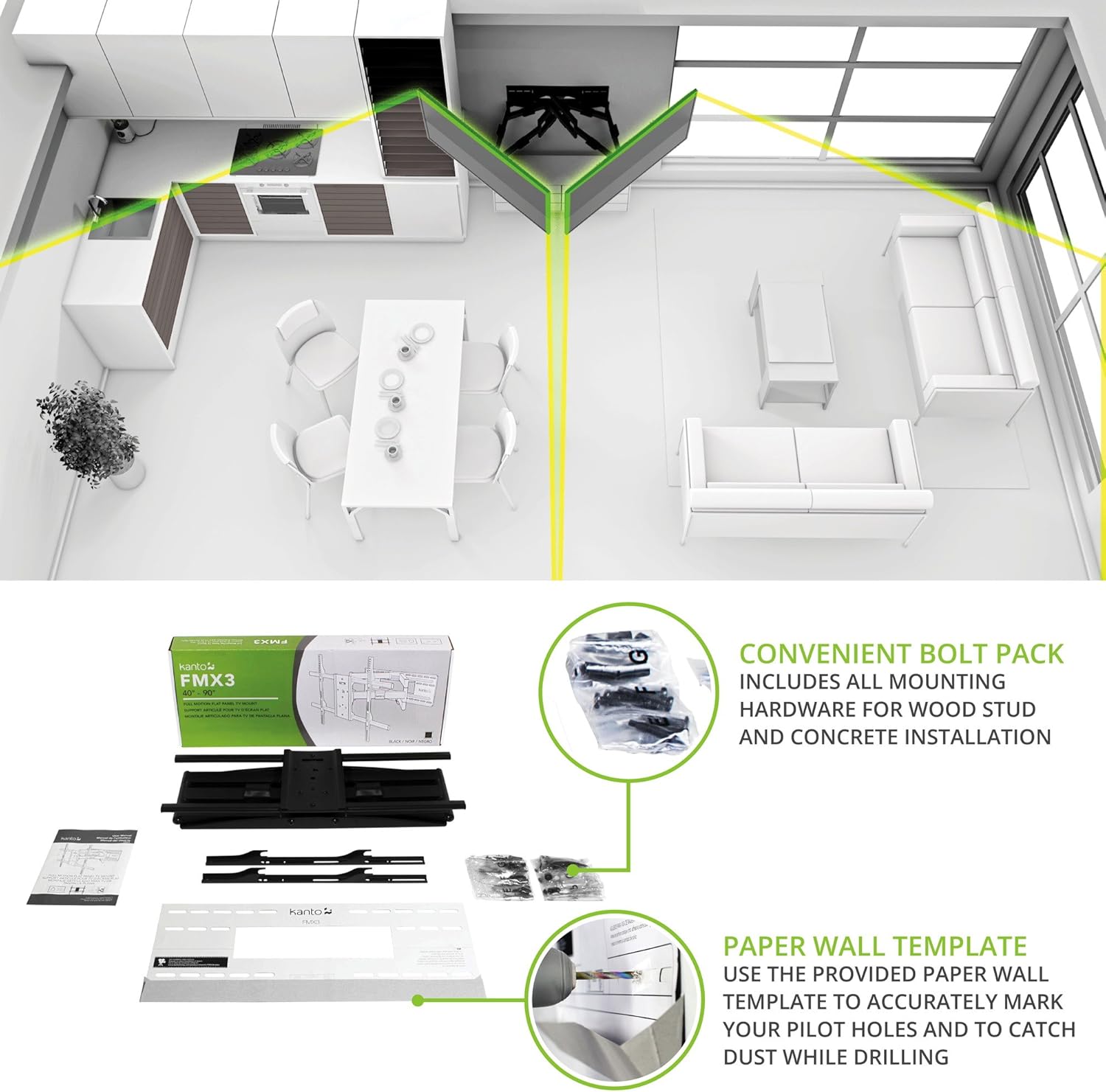 - SPACE SAVING - Improve the appearance of any room by mounting your TV with the FMX3! Cable management keeps your cables tidy and out of sight for a clean, organized look.