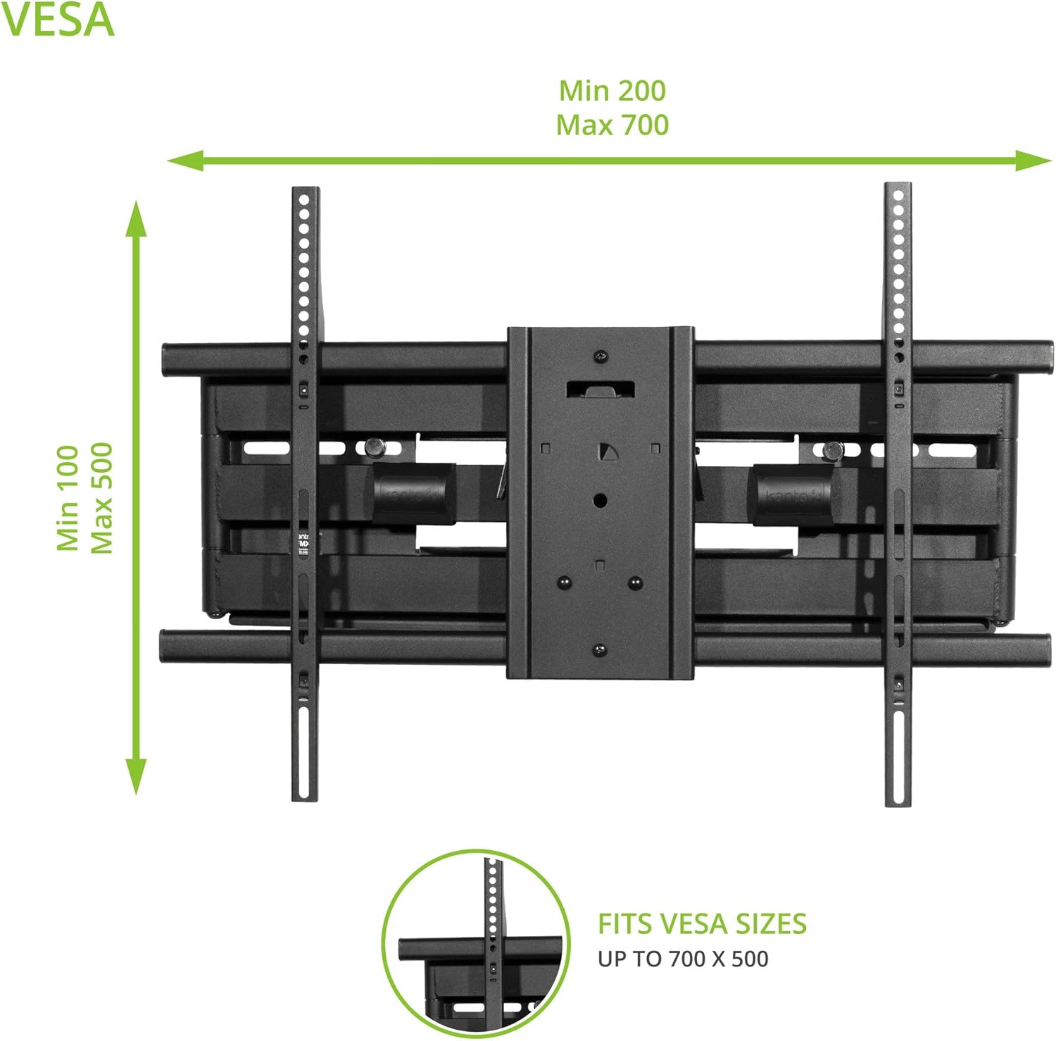 - SUPERIOR CONSTRUCTION - Solid steel construction and heavy-duty lag bolts are designed to support up to 150 pounds and accommodates VESA sizes from 200x100 to 700x500.