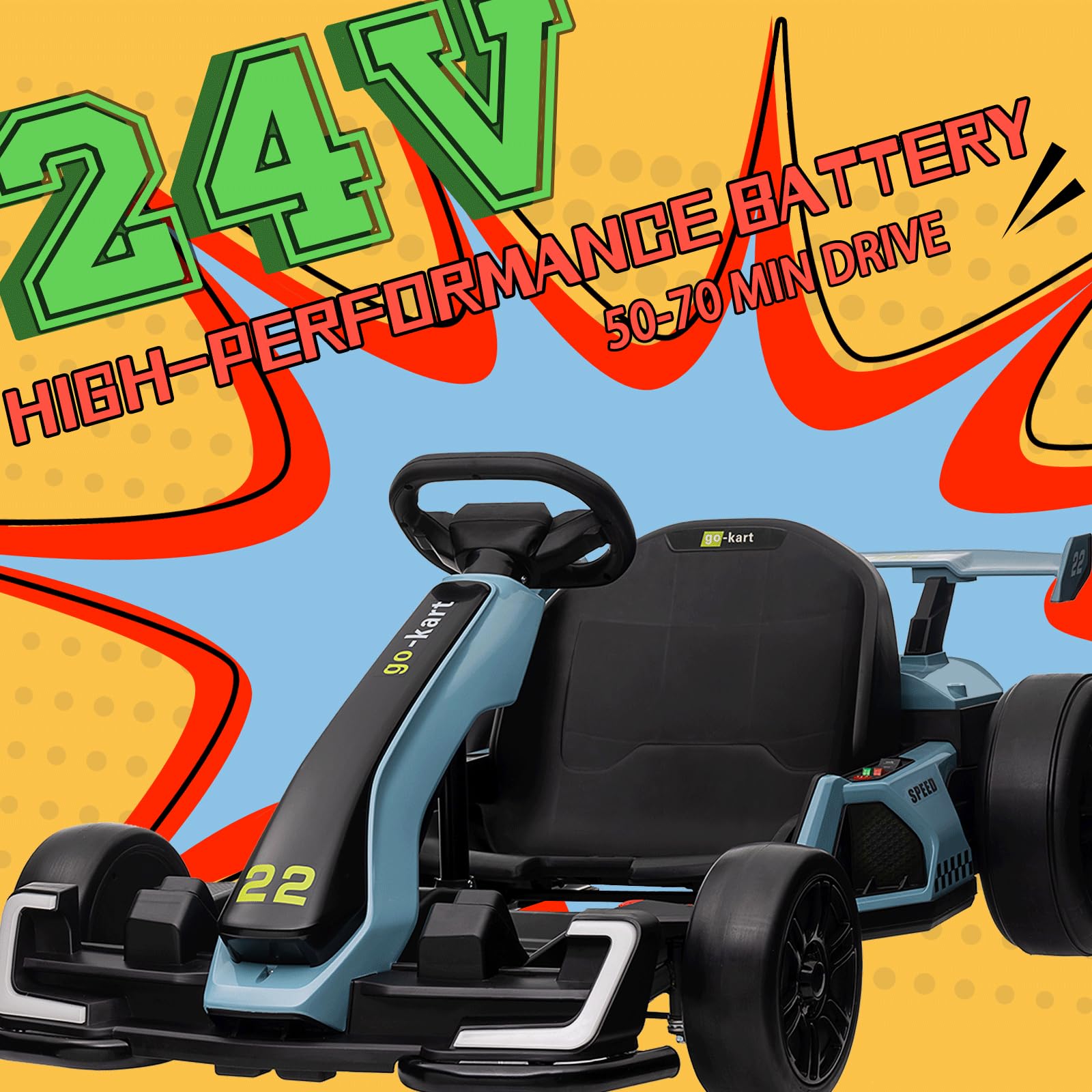 KerryYoo K61 Go Kart Electric Drift Kart with Length Adjustable Seat, 24V Outdoor Ride on Toy with 4 Speed Mode, Crazy Cart for Kids 6-12 Years Old, Fast 300W Motor, 8.5 MPH, Bluetooth - Blue
