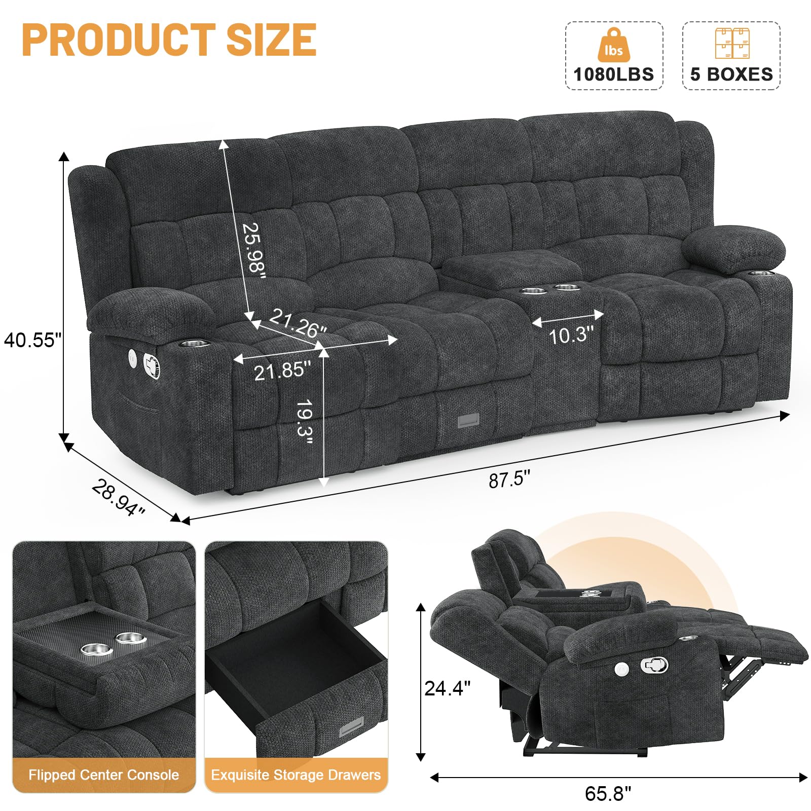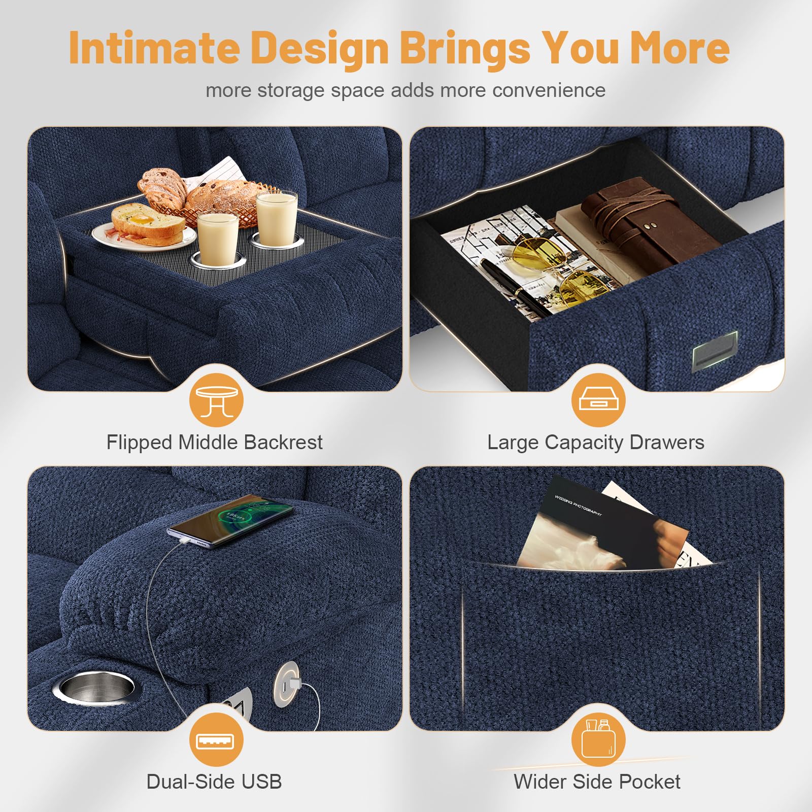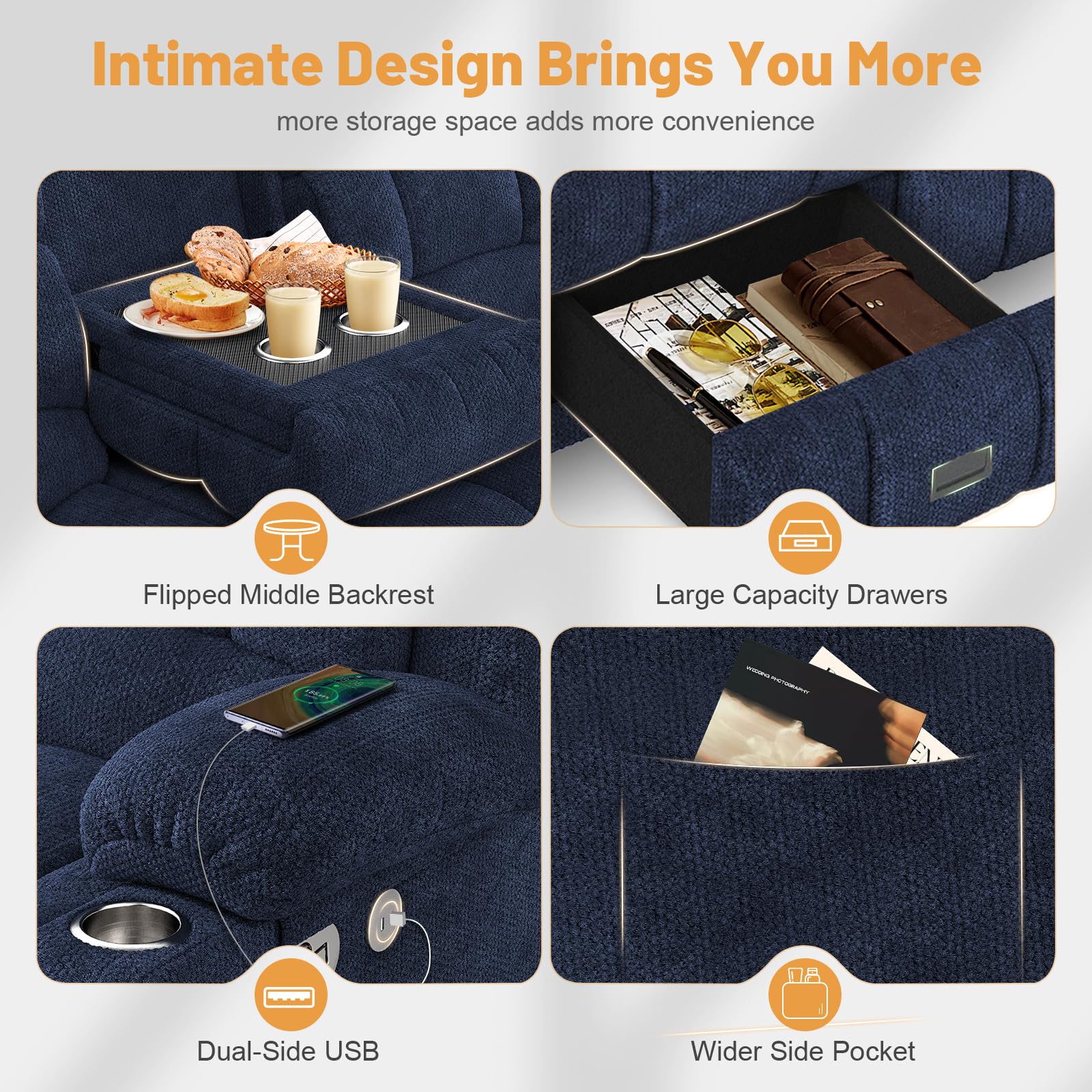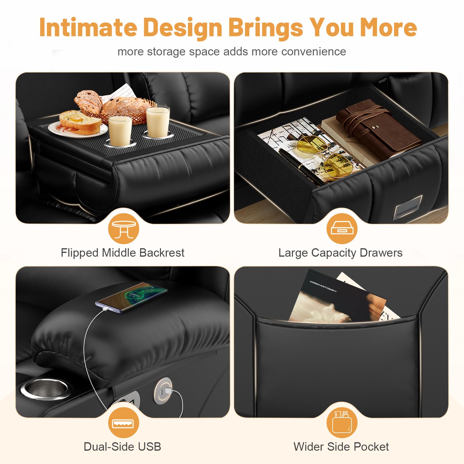 - 【Intimate Design Brings You More】Perfect for movie nights with the family, the middle backrest can be folded down to become a table for drinks and food. In addition, the home theater recliner sofa is equipped with USB charging port, side pockets, and a large drawer for storing daily necessities, greatly enhancing recliner space utilization. As our designers say, "Optimizing space is not just about saving room, it’s about enhancing your living comfort and quality of life, making every moment enjoyable."