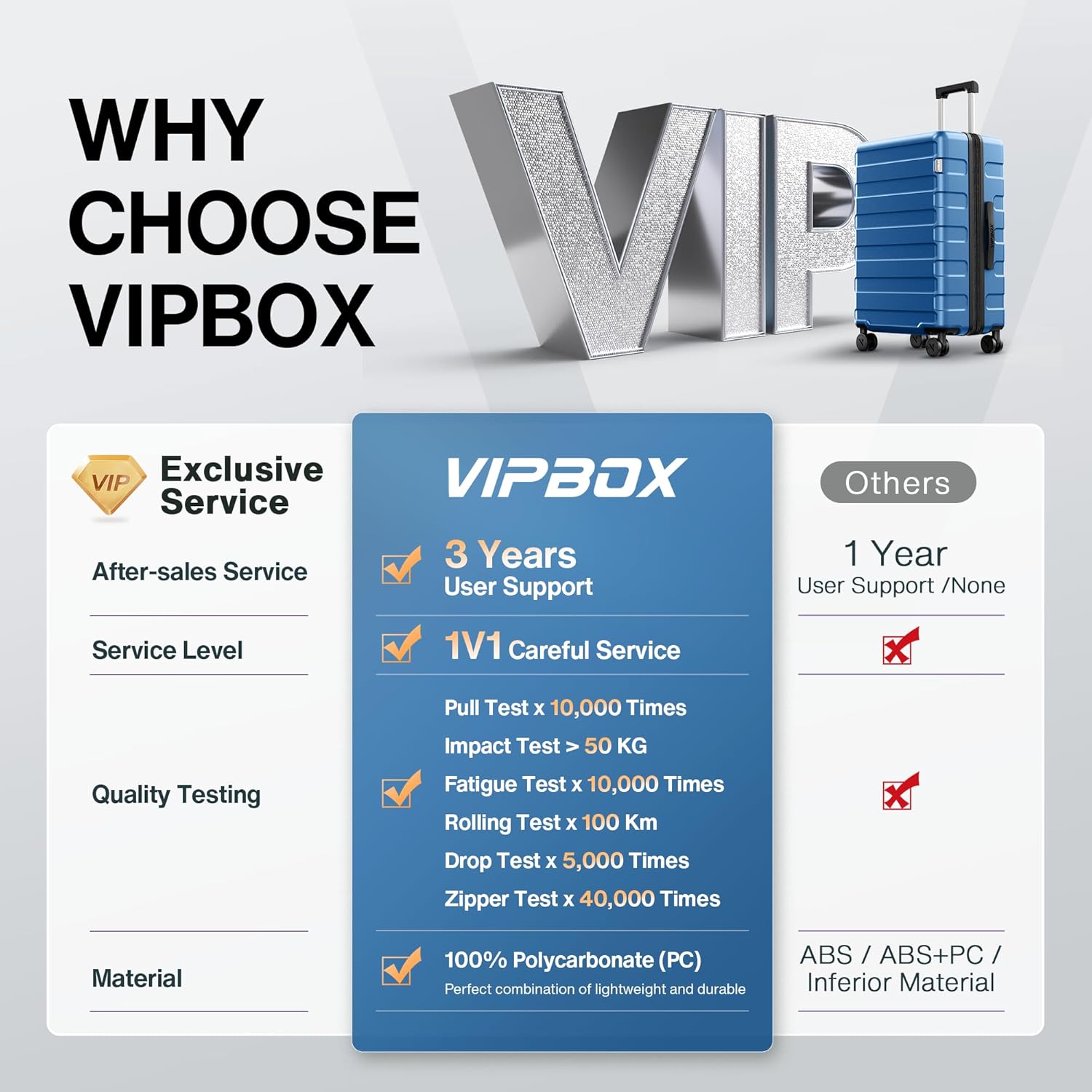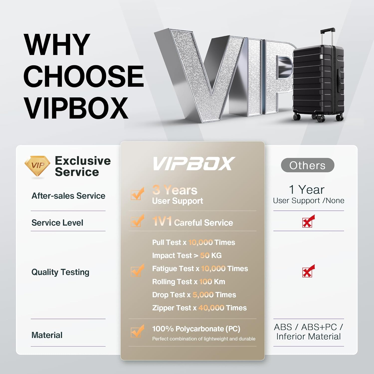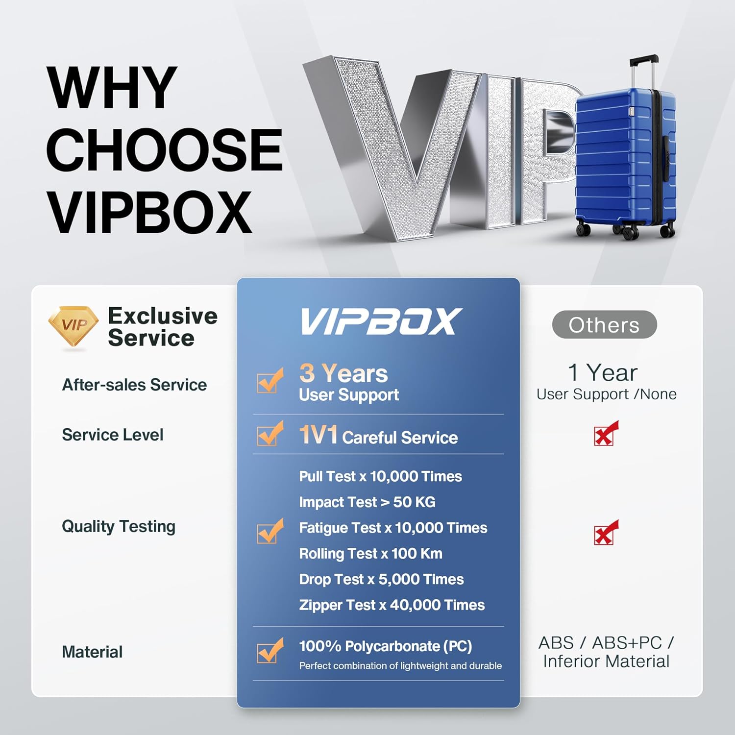 - VIPBOX LUGGAGE SETS 3 PIECE-- 3-YEAR GLOBAL VIP WARRANTY: At Vipbox, customer satisfaction is our top priority. Every screw is rigorously quality tested to meet stringent standards, ensuring it can handle any adventure. Our dedicated customer service team is always here to answer questions and provide 1V1 VIP support. 100% peace of mind