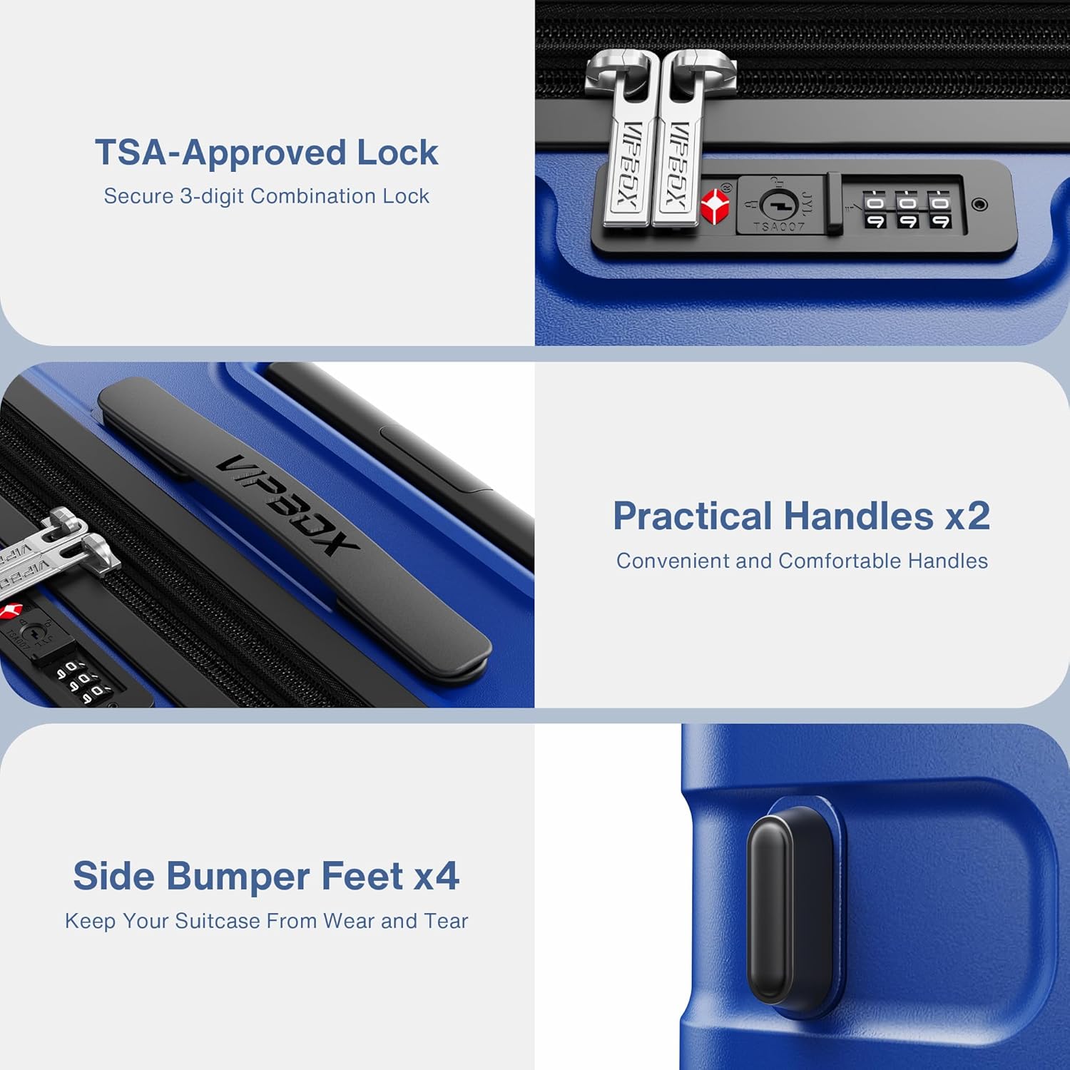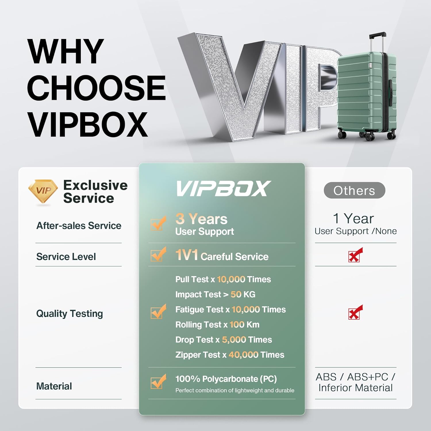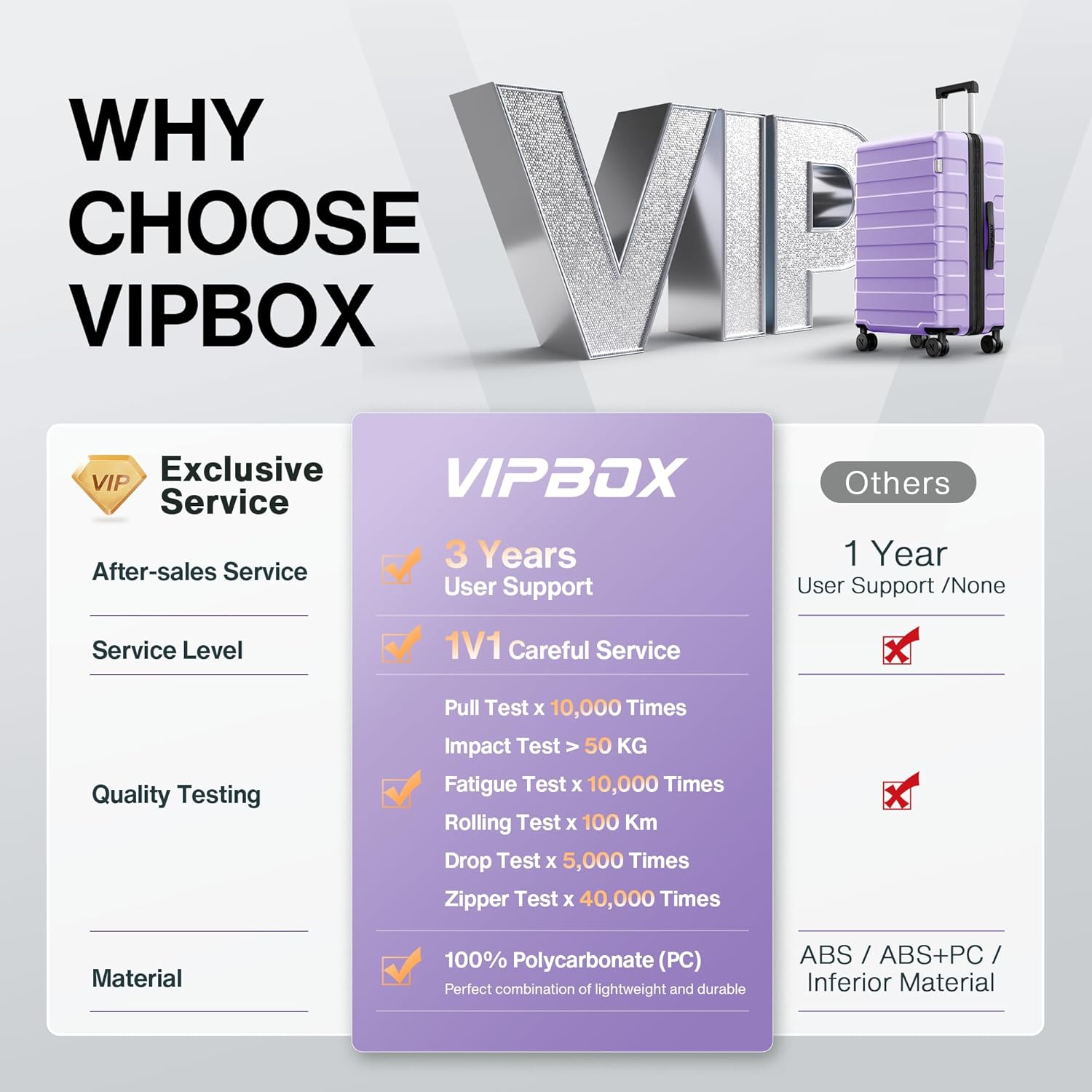 - VIPBOX LUGGAGE SETS 3 PIECE-- 3-YEAR GLOBAL VIP WARRANTY: At Vipbox, customer satisfaction is our top priority. Every screw is rigorously quality tested to meet stringent standards, ensuring it can handle any adventure. Our dedicated customer service team is always here to answer questions and provide 1V1 VIP support. 100% peace of mind