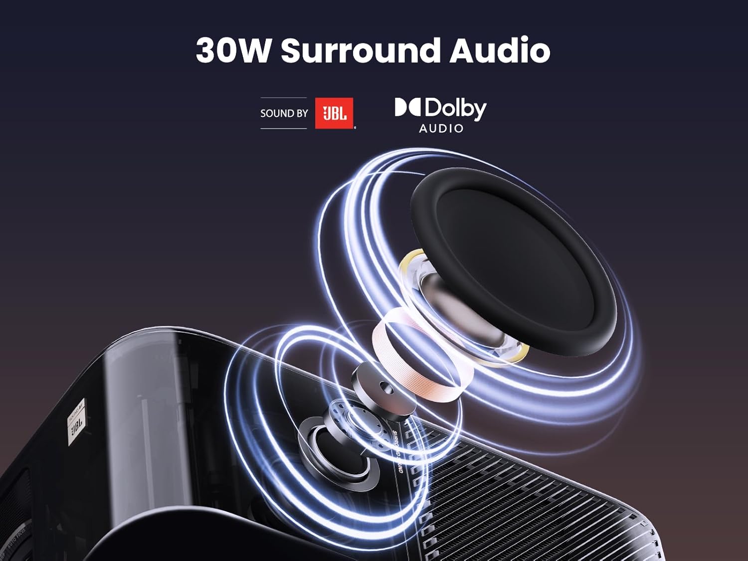 - 【30W JBL Surround Sound & Dolby Audio】The K3 boasts built-in audio system with dual 15W JBL speakers and Dolby Audio creates an immersive theatre-like soundscape.This sound system features NdFeB full-range drivers, meticulously crafted exclusively for the Yaber K3, accompanied by a passive radiator designed to enhance low-frequency efficiency and a finely calibrated audio DSP. The result is a symphony of astonishing mid-range clarity, sumptuous bass, and delicate treble.