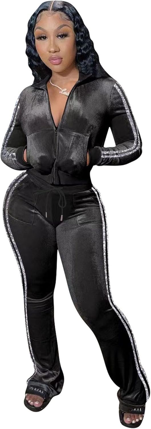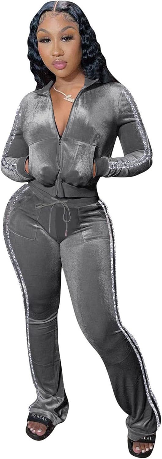 【Novelty Design】Womens velour sweatsuit suit for women designed in simply solid color, which will never go out of date. Solid color zipper up top features 2 kangaroo pockets, make your hands warm and convenient to carry items, like phone, keys. The bodycon tracksuit featuring sequins patchwork, sparkly two side makes your oufit more fashionable. Long elastic sweatpant make your legs warm and skin-friendly, features 2 side pockets and 2 back button pockets, convenient for storage items.