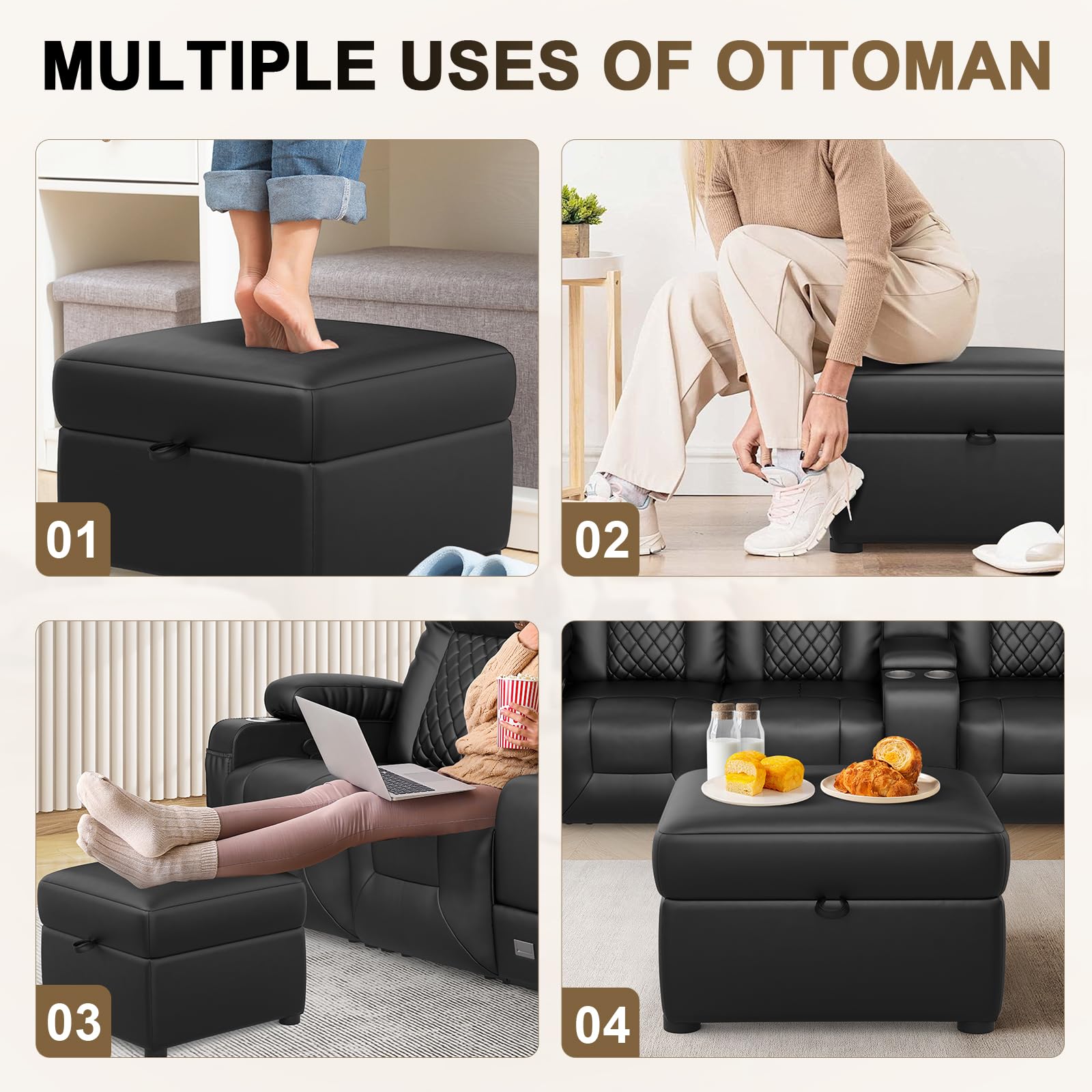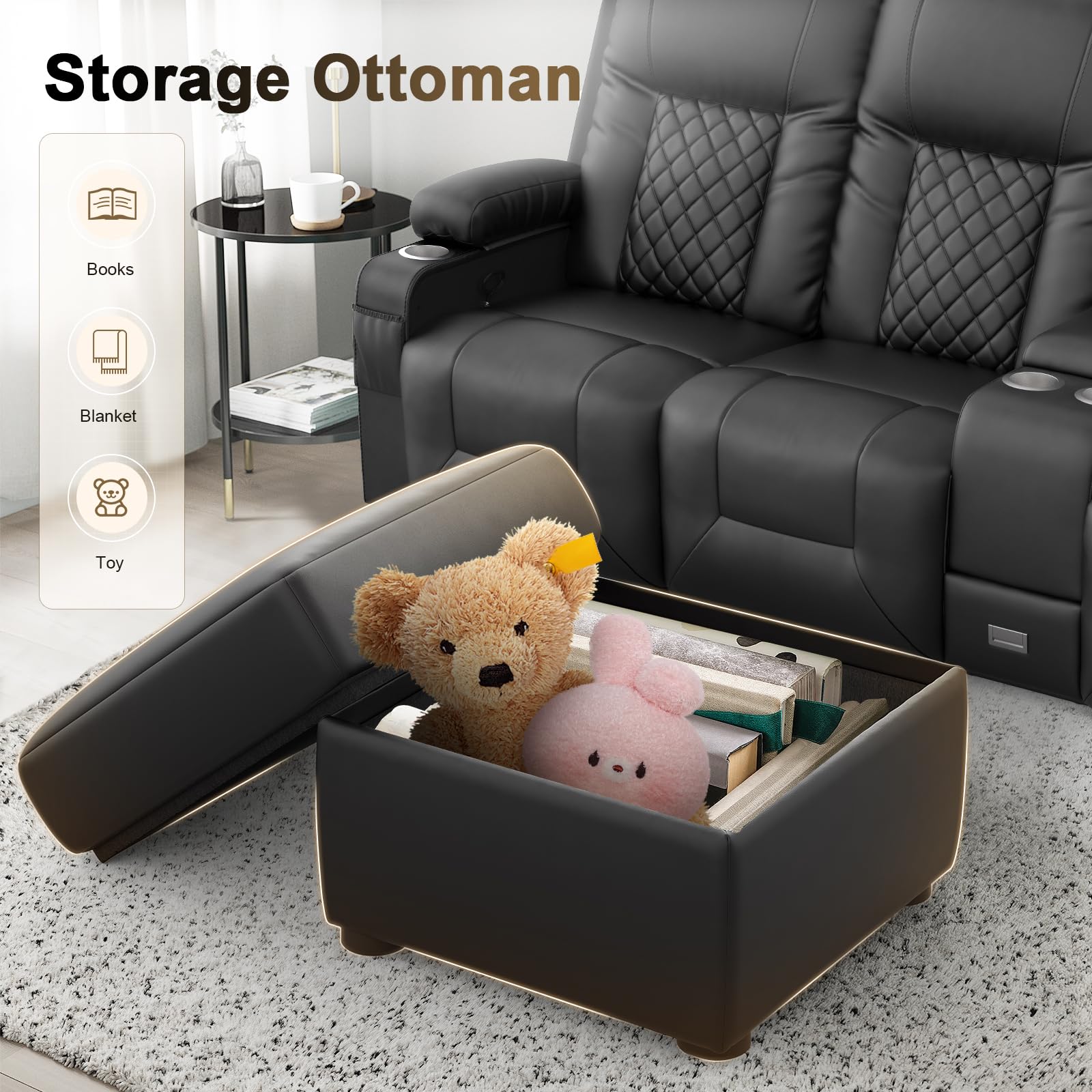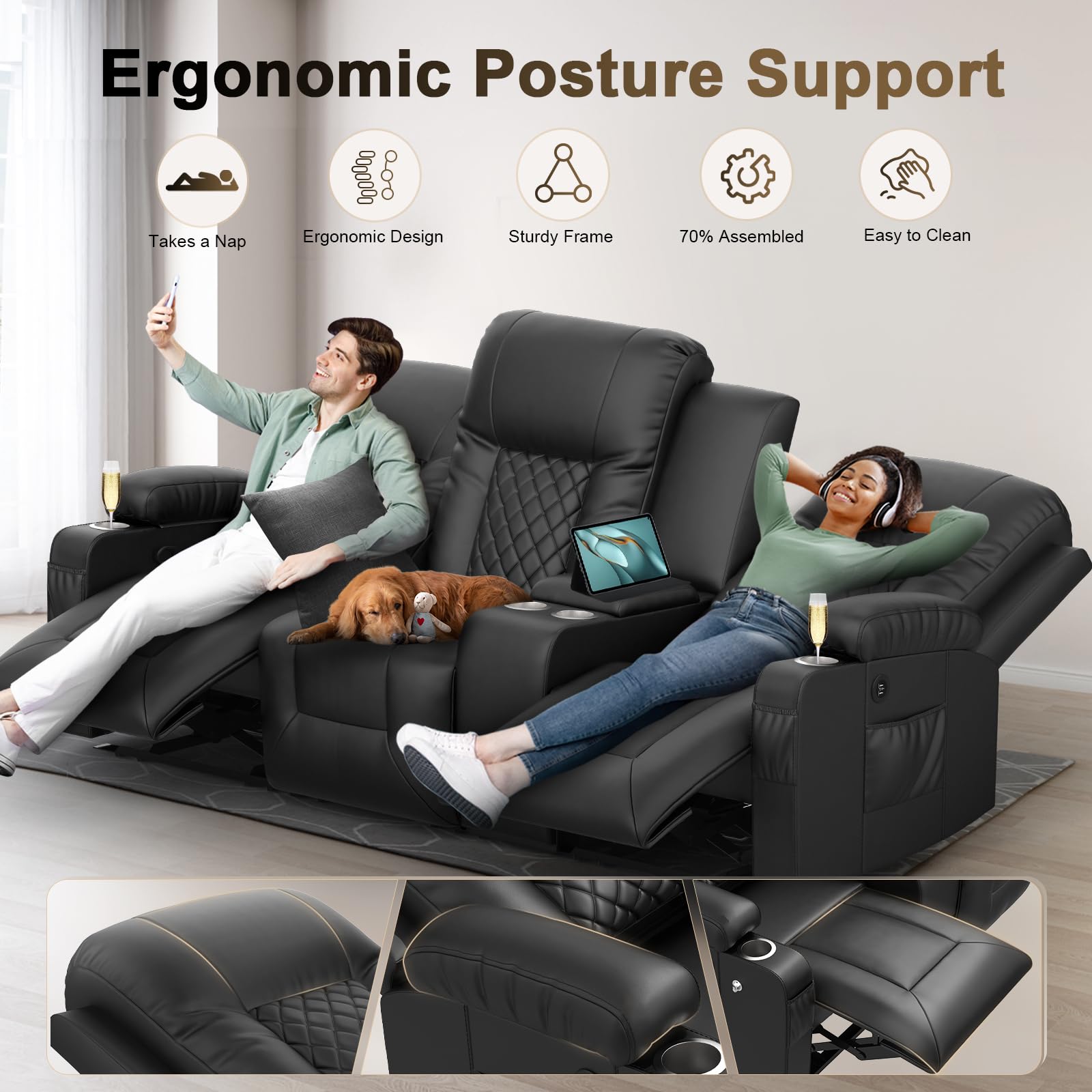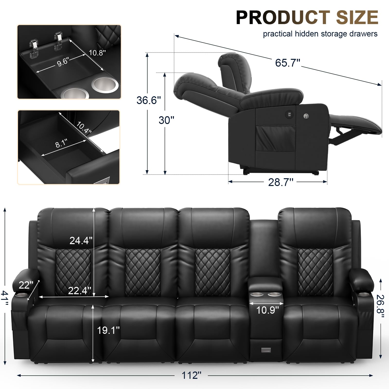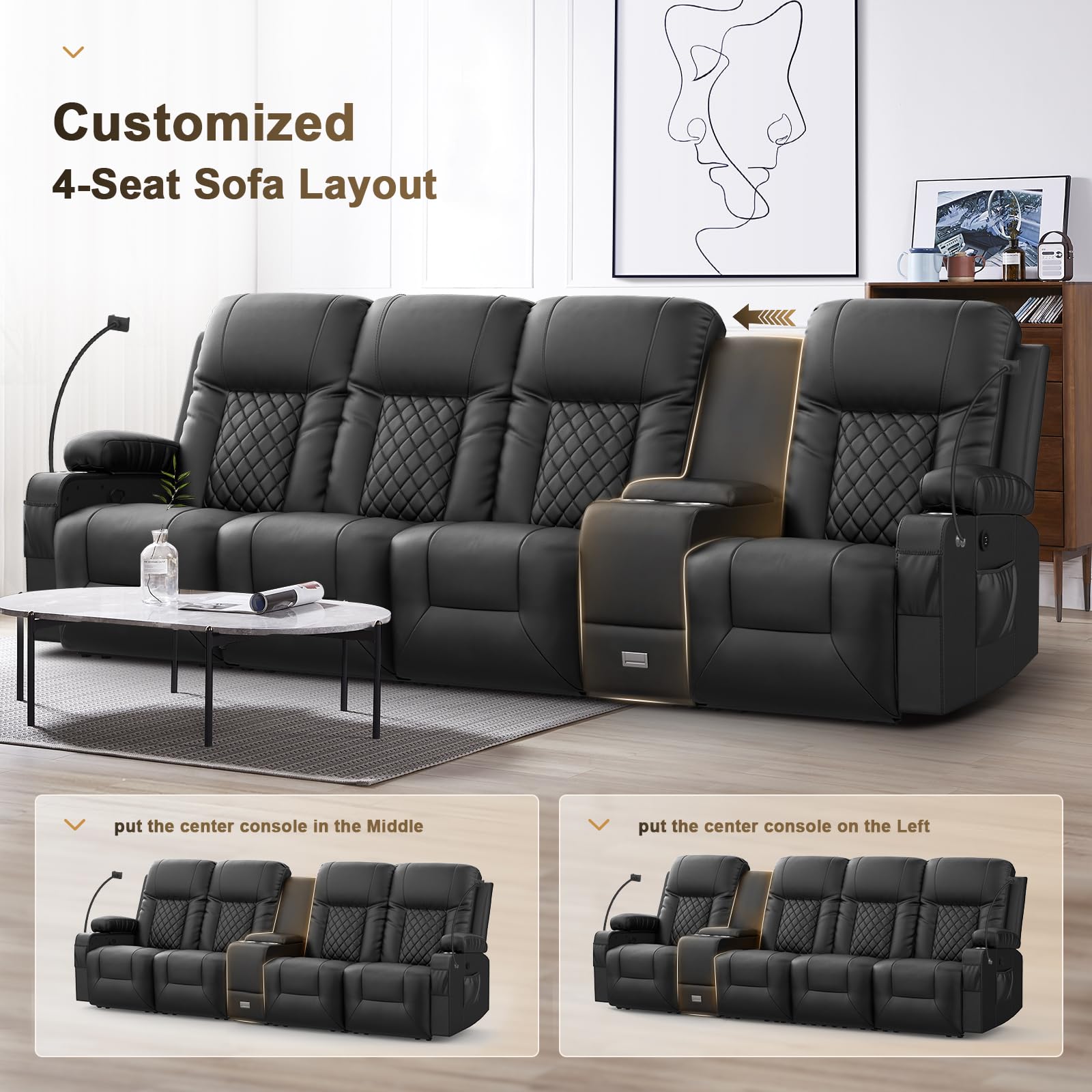 - 【Multi-Functional Storage Recliner】Our home theater three-seater has four cup holders so you can enjoy your favorite drink or popcorn with friends on movie night without worrying about spills. Two side pockets and a center console with storage boxes and delicate drawers, provide dedicated space for your essentials, keeping your living area organized and clutter-free. The convenient hideaway storage keeps everything within easy reach.